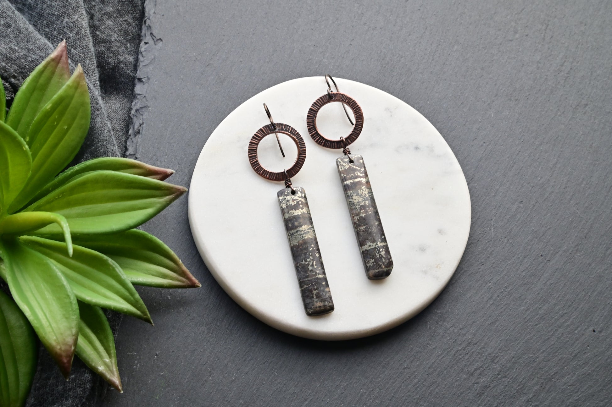 Hand textured Copper rings paired with long rectangular Pyrite gemstones with a smooth, semi-shiny surface.
