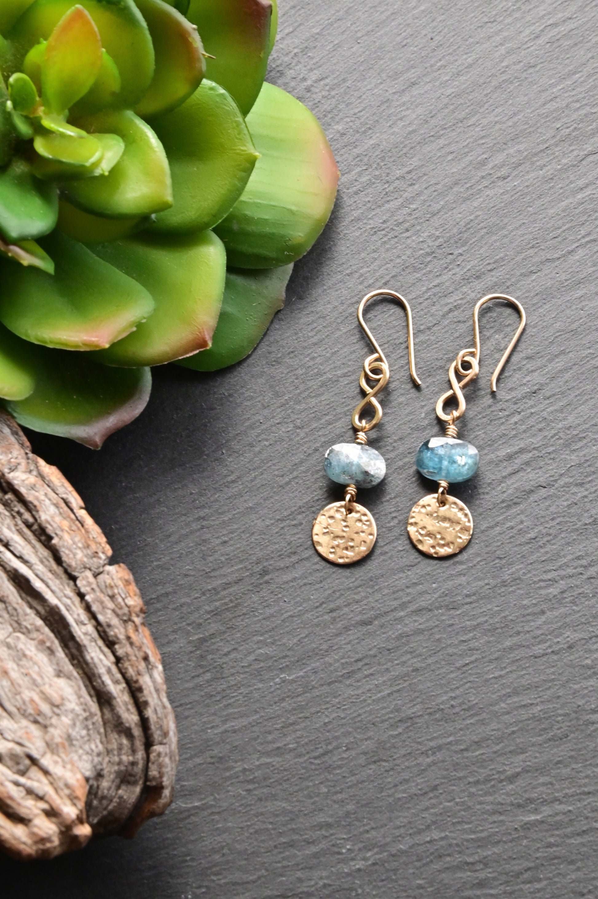 Handcrafted and "moon crater" textured drops and infinity links in 14k Gold-fill, paired with faceted Blue Kyanite gemstones.