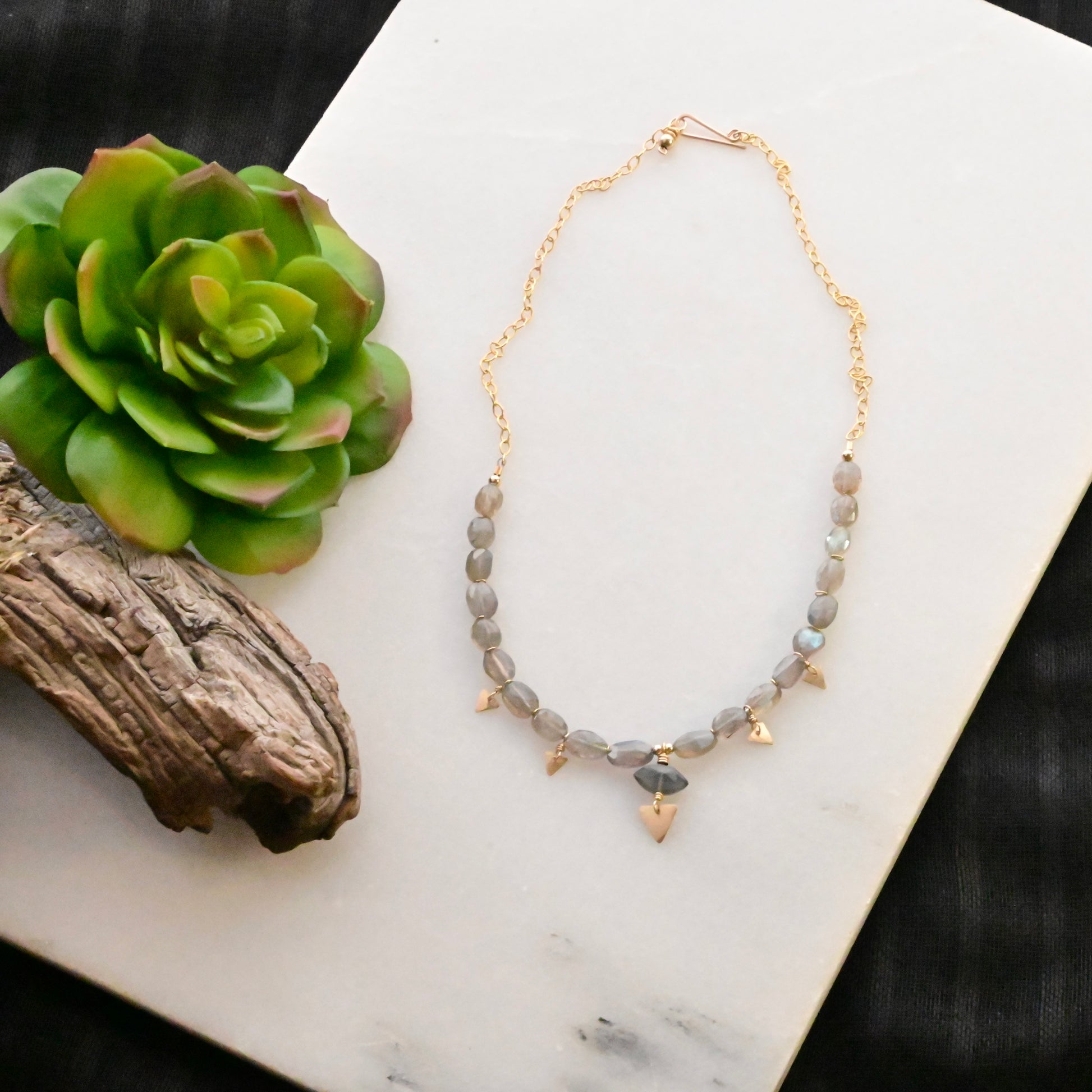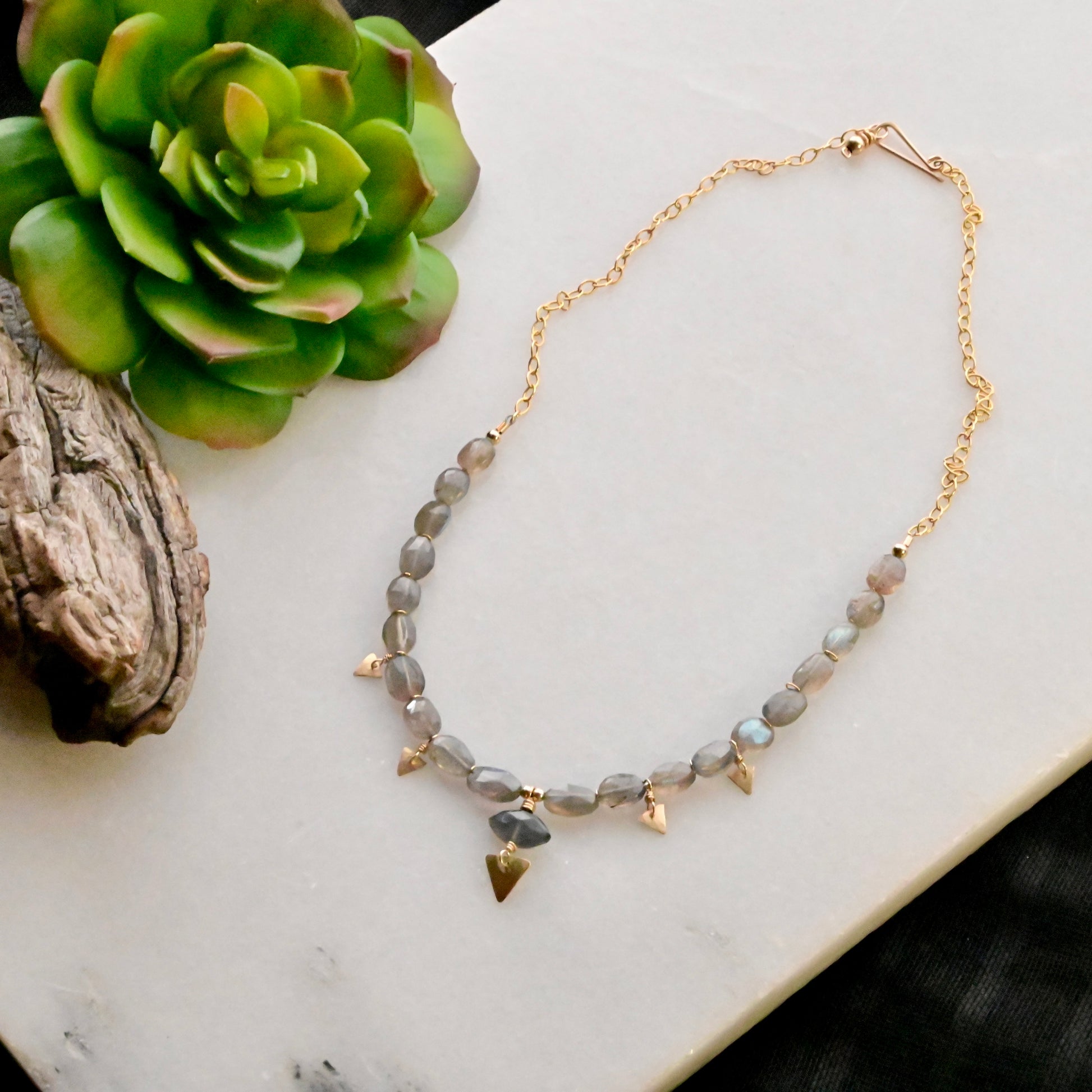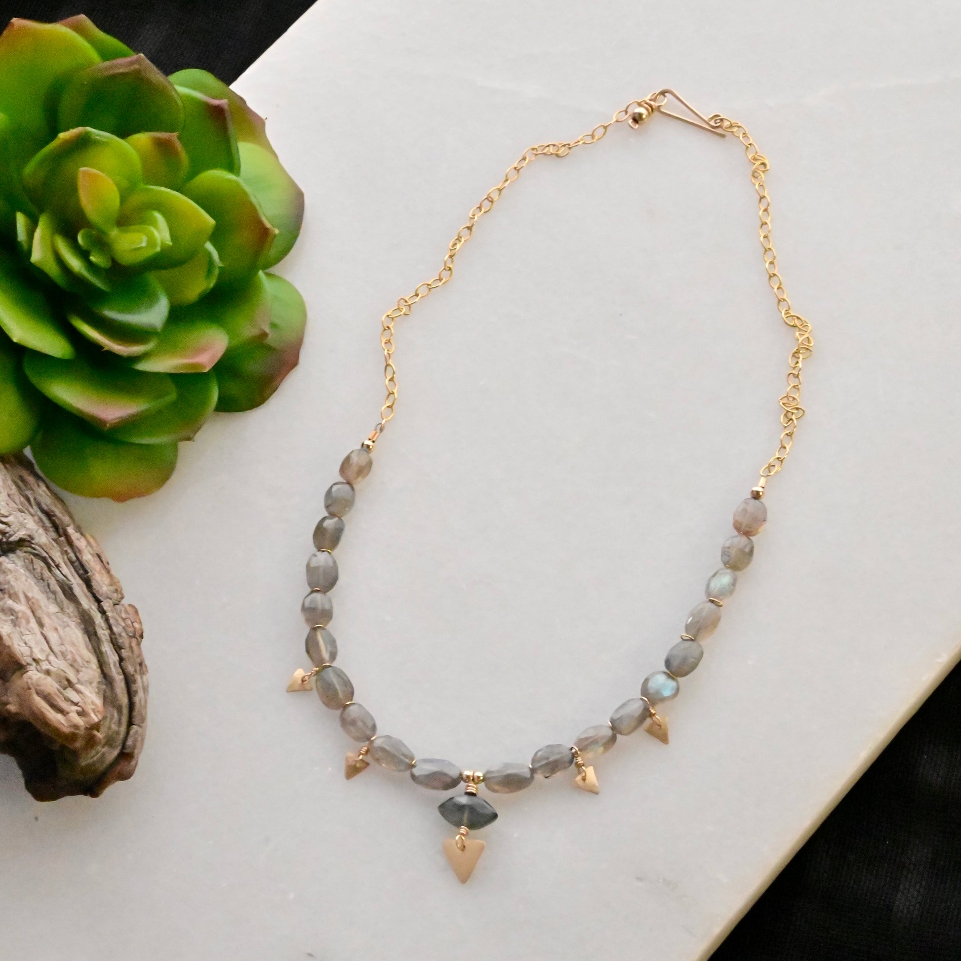 Handcrafted and textured 14k Gold-fill triangle drops mixed within faceted Labradorite gemstones.
