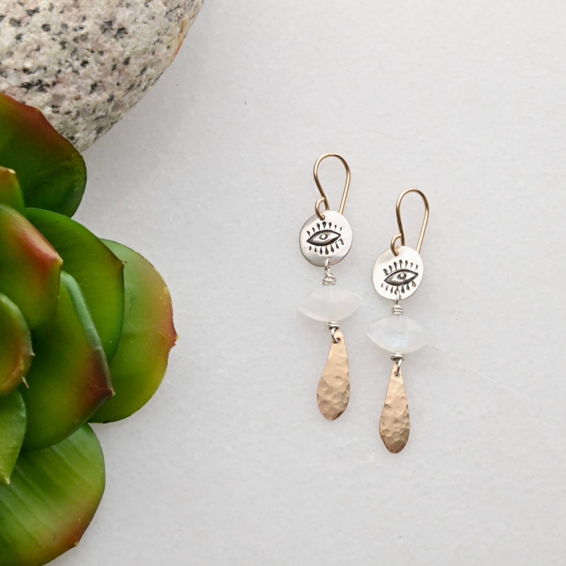 Handcrafted and stamped Sterling Silver "Eyes" and 14k Gold-fill hammered teardrops, complimented with faceted eye-shaped Moonstone gems.