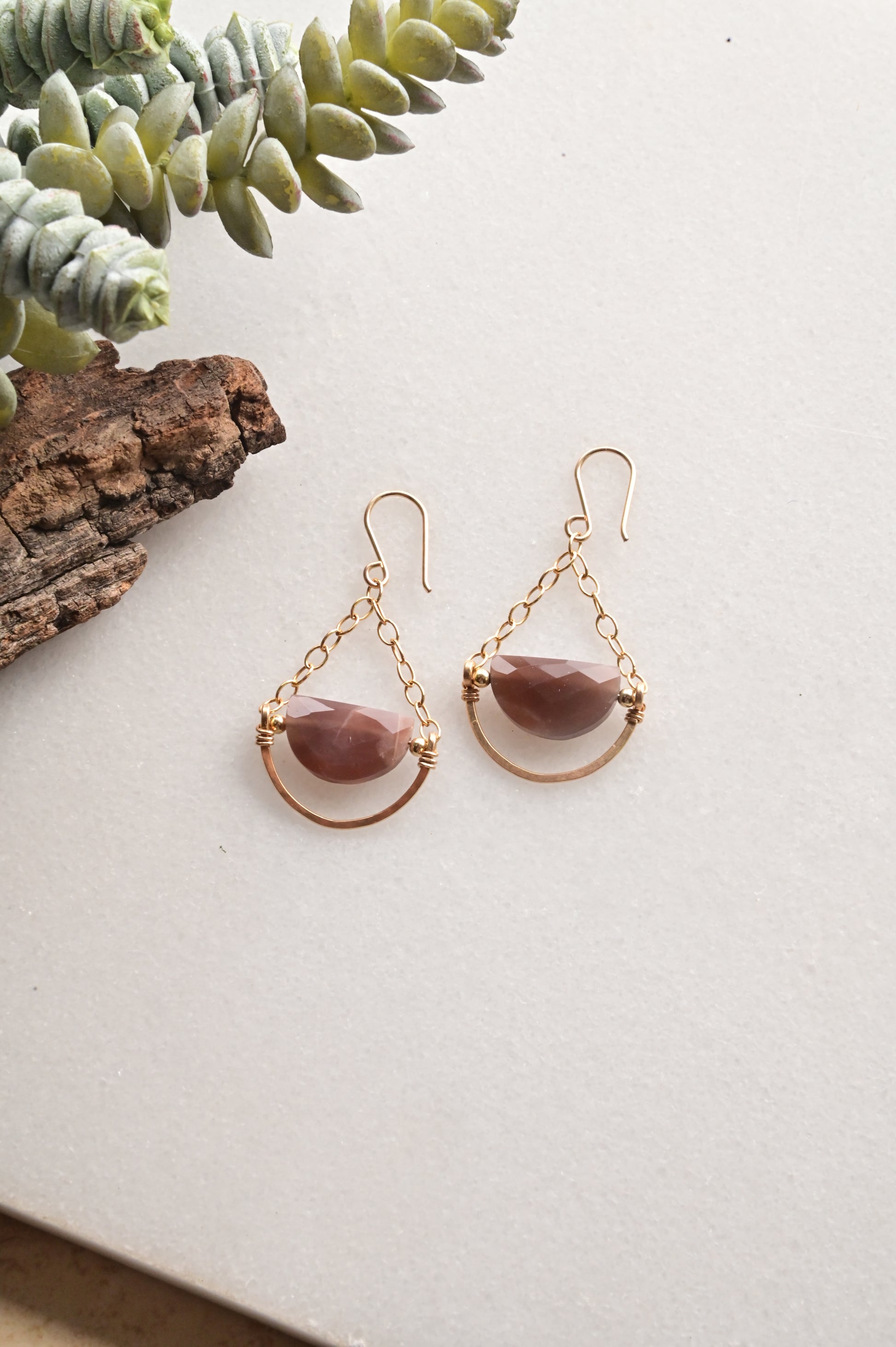 Hand-formed and hammered hoop earrings in 14k Gold-fill, paired with dark brown faceted Chocolate Moonstone gems.