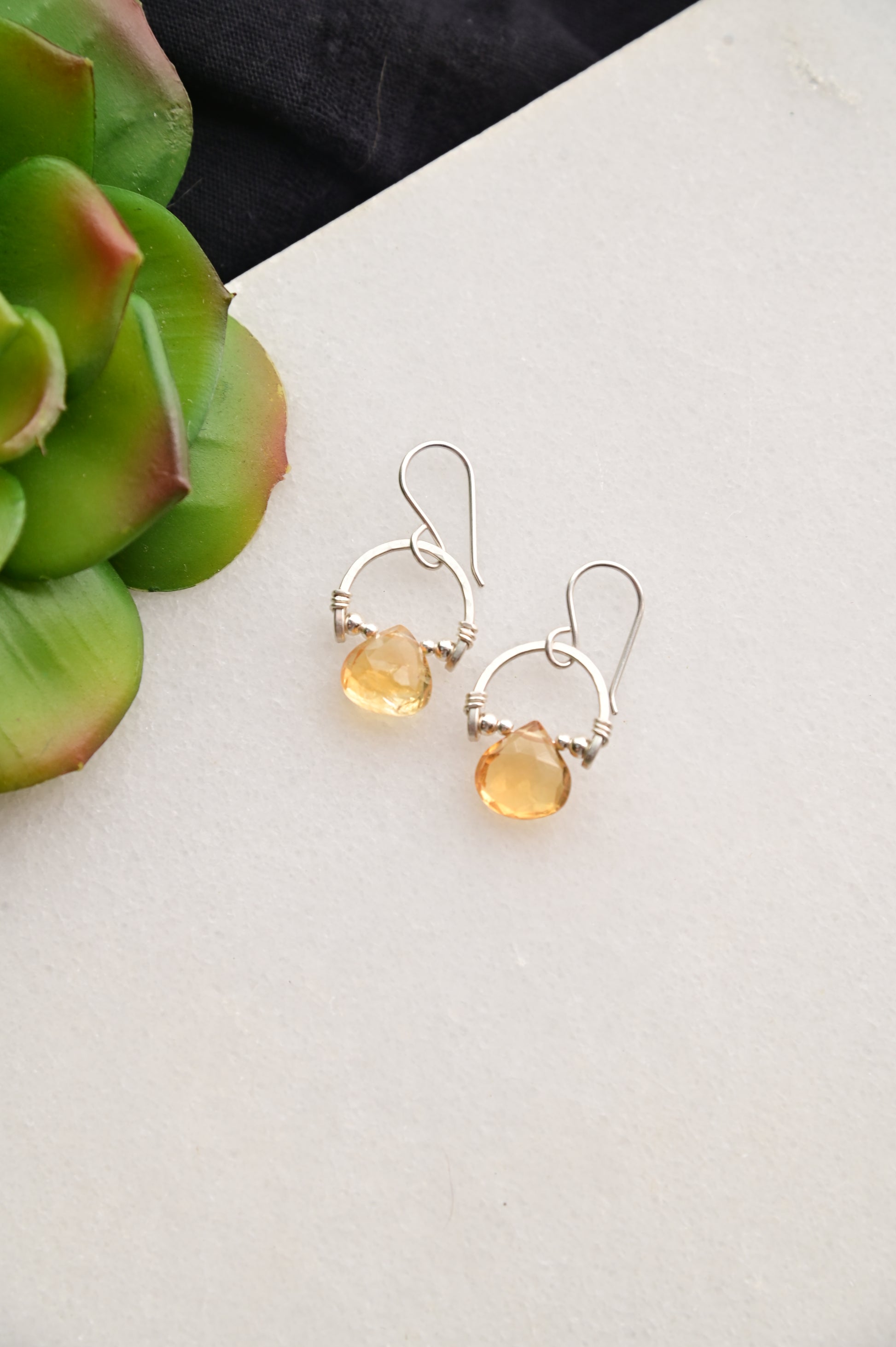 Hammered Hoops: Citrine + Silver Earrings