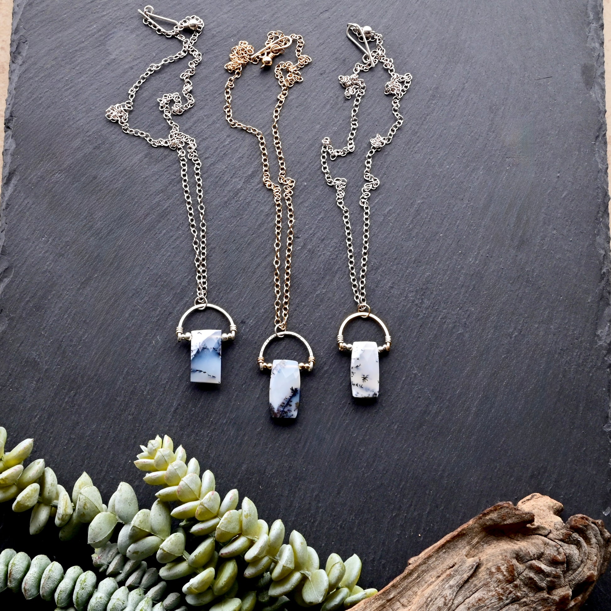 Hammered Hoops: Dendrite Opal + Mixed Metals Necklaces
