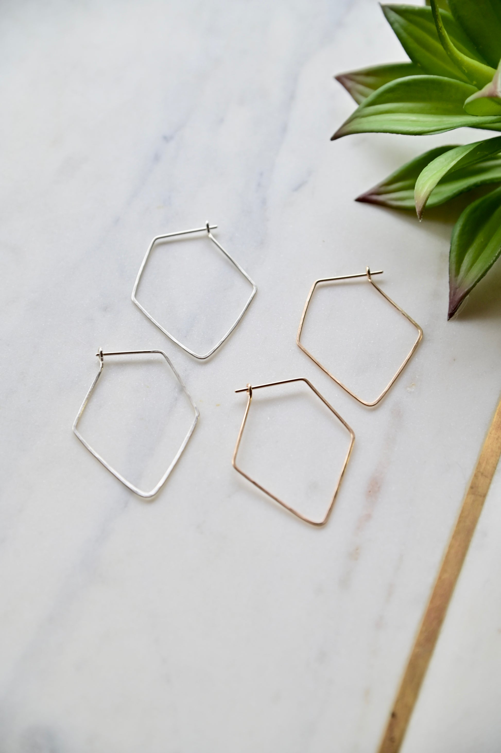 Crafted from Sterling Silver or 14k Gold-fill metals, these earrings measure 1.5 inches at their widest point and hang down around 2 inches long.