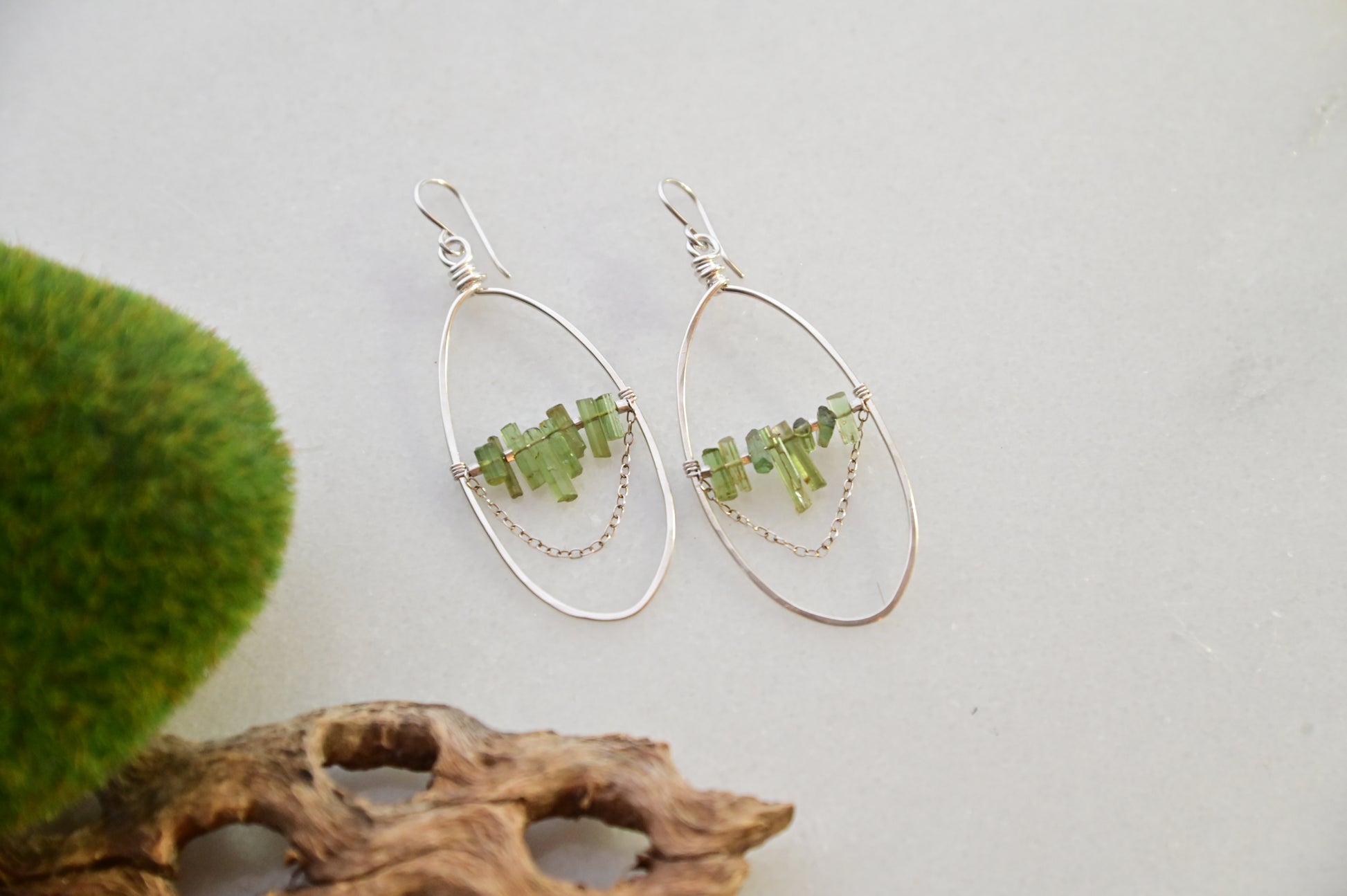 Delicate hand-formed hoop earrings in Sterling Silver with small Green Tourmaline gemstones set within, accented with sterling chain.