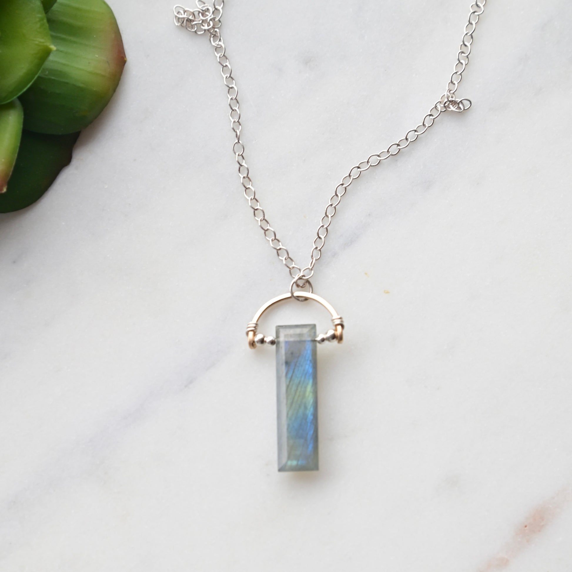 Hand-formed hoops in 14k Gold-fill with a long rectangular Labradorite gemstone within, and complimented with Sterling Silver accents and chain.