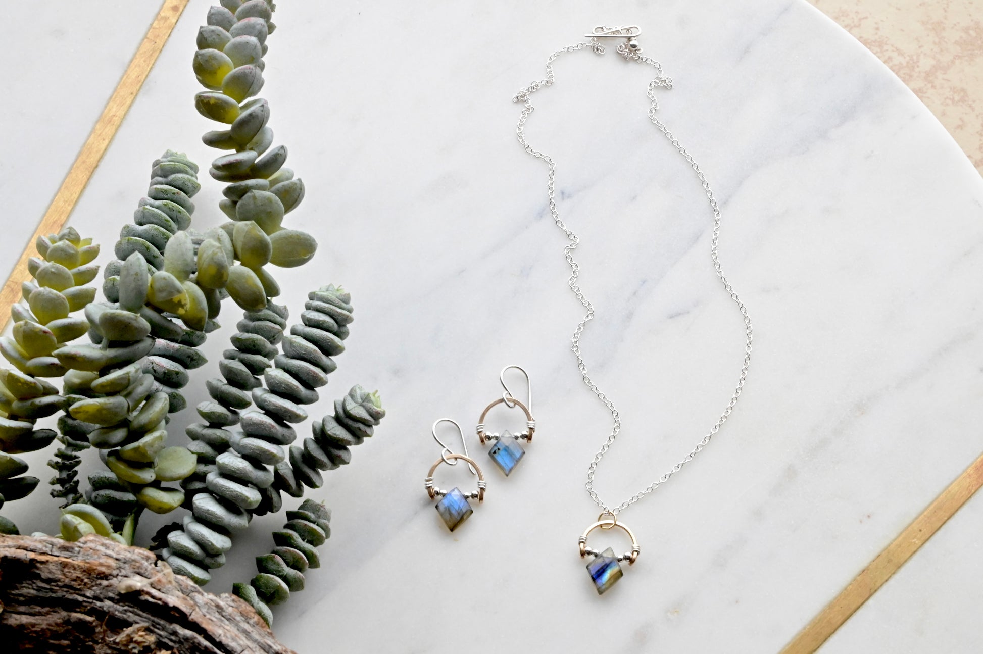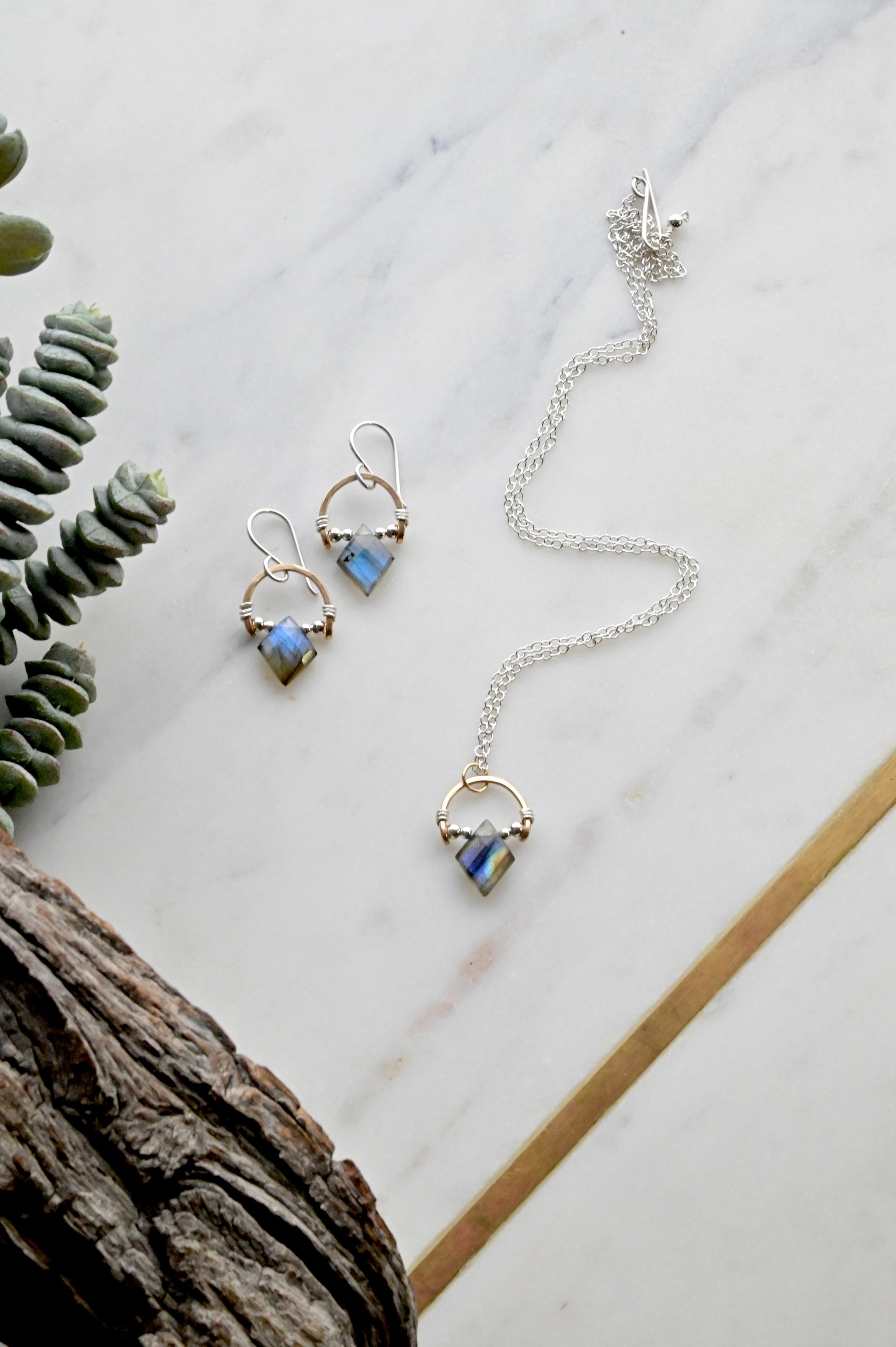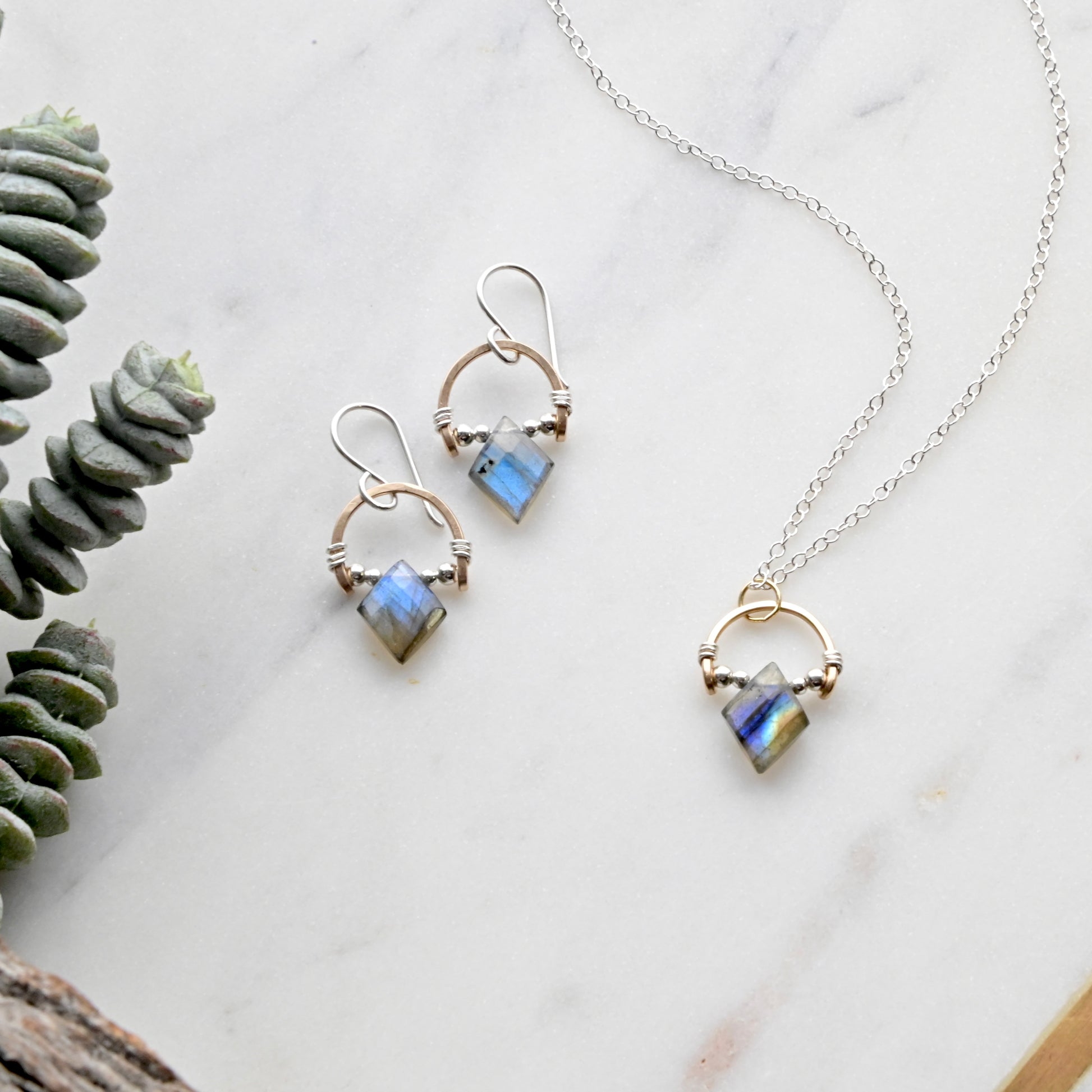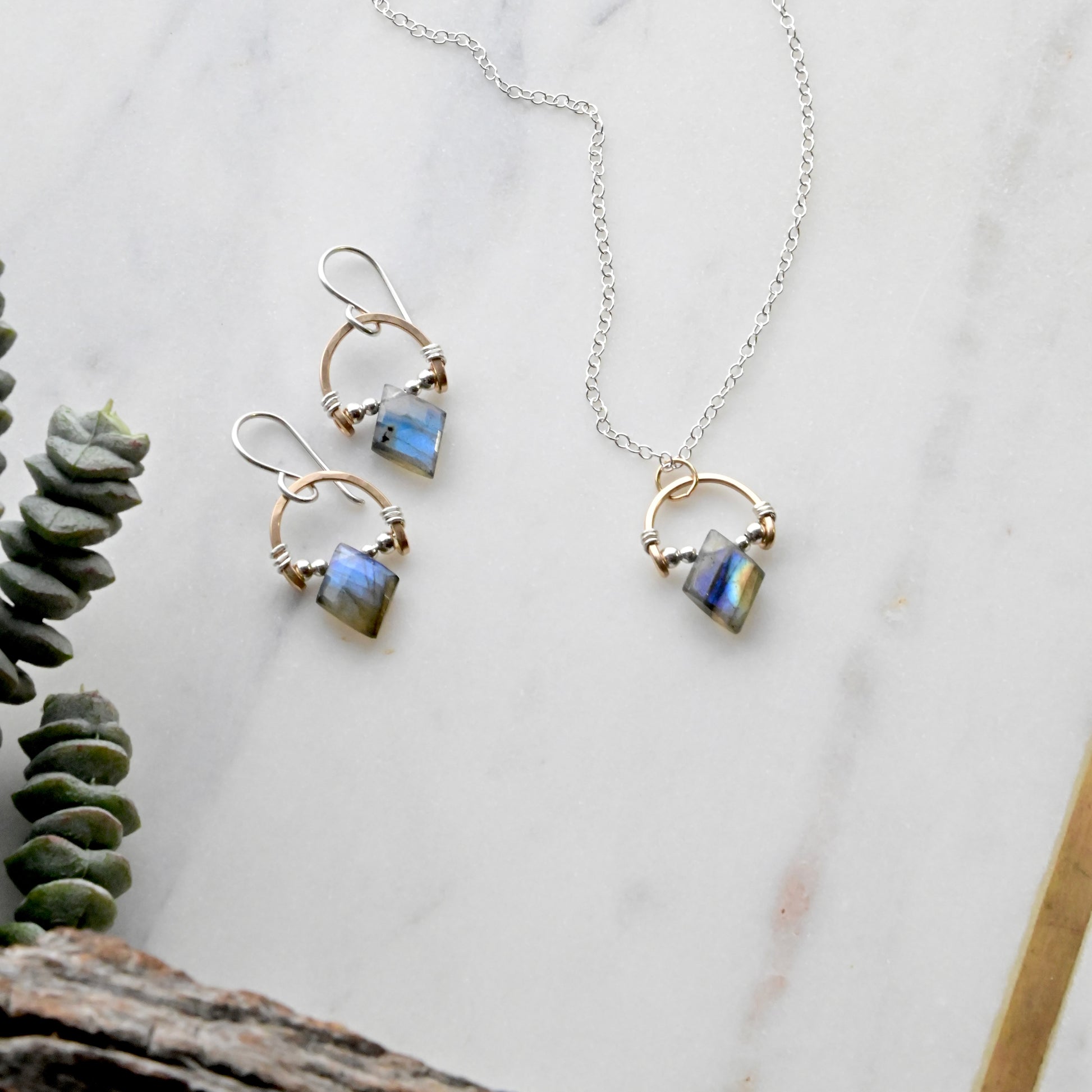 Hammered Hoops: Labradorite + Mixed Metals Necklace and Earrings
