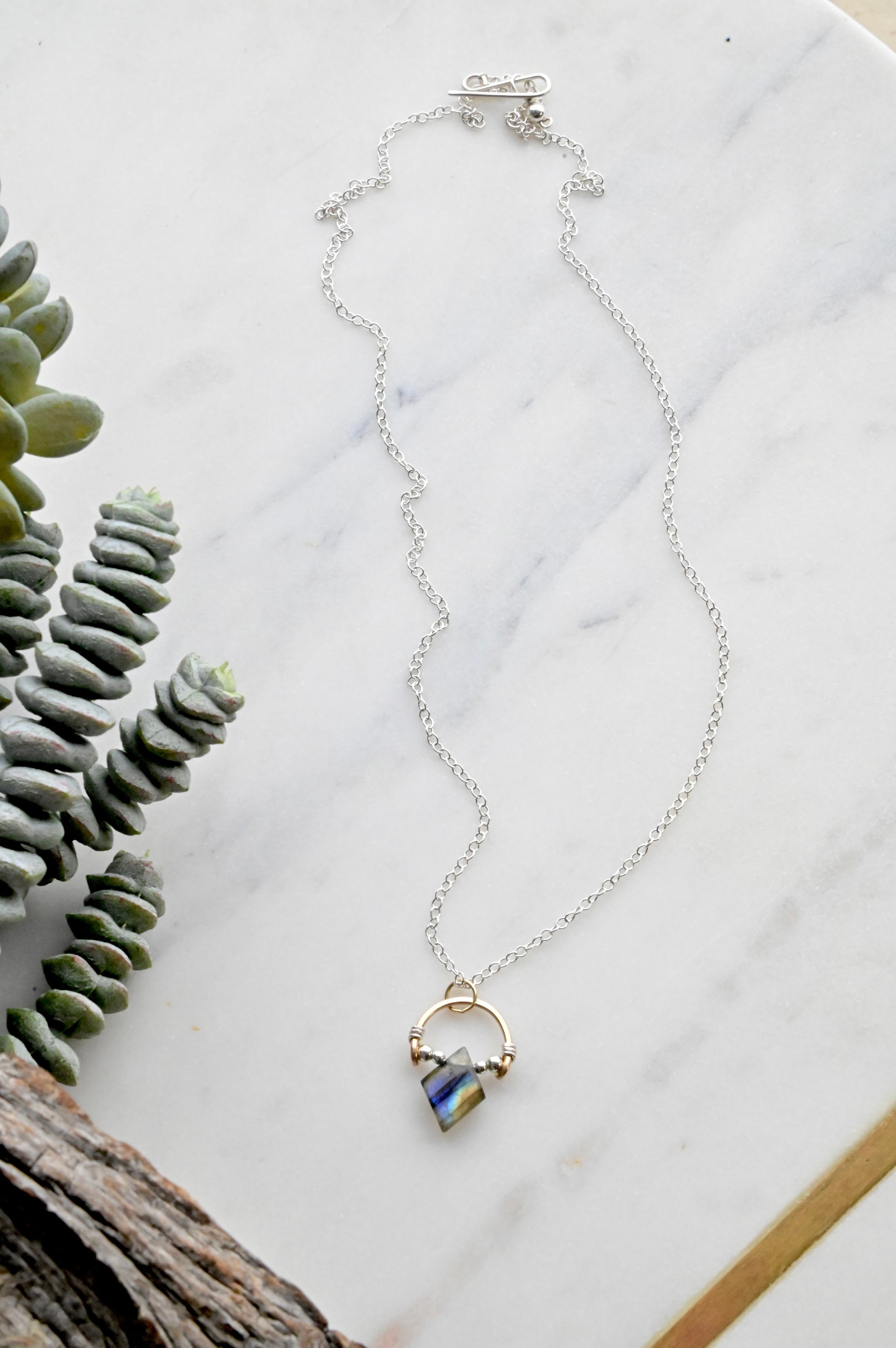 Hand-formed 14k Gold-fill hoops with a diamond-shaped Labradorite gemstone set within and complimented with Sterling Silver accents.