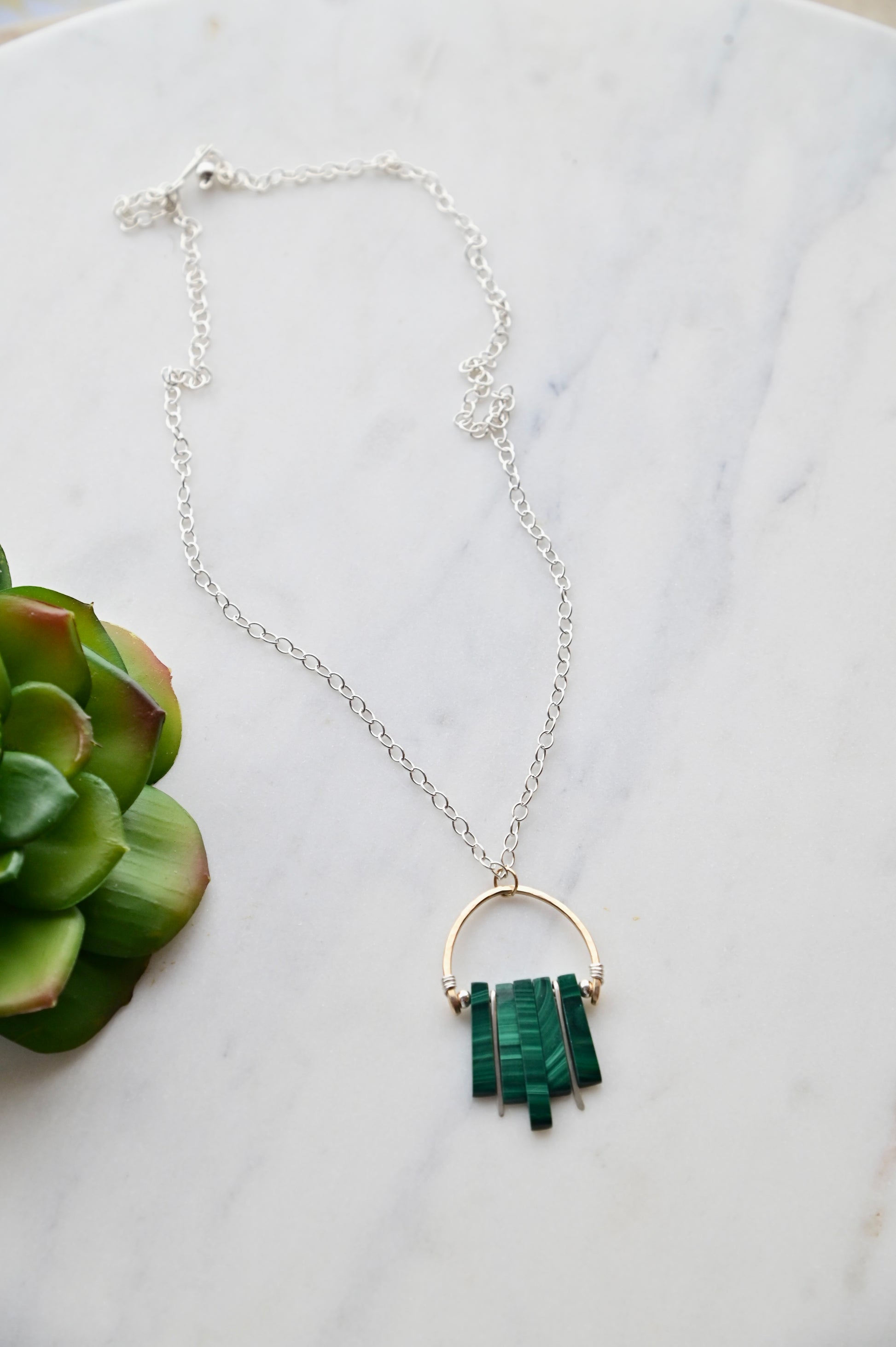 Hammered Hoops Necklace in Malachite with Sterling Silver and Gold-fill