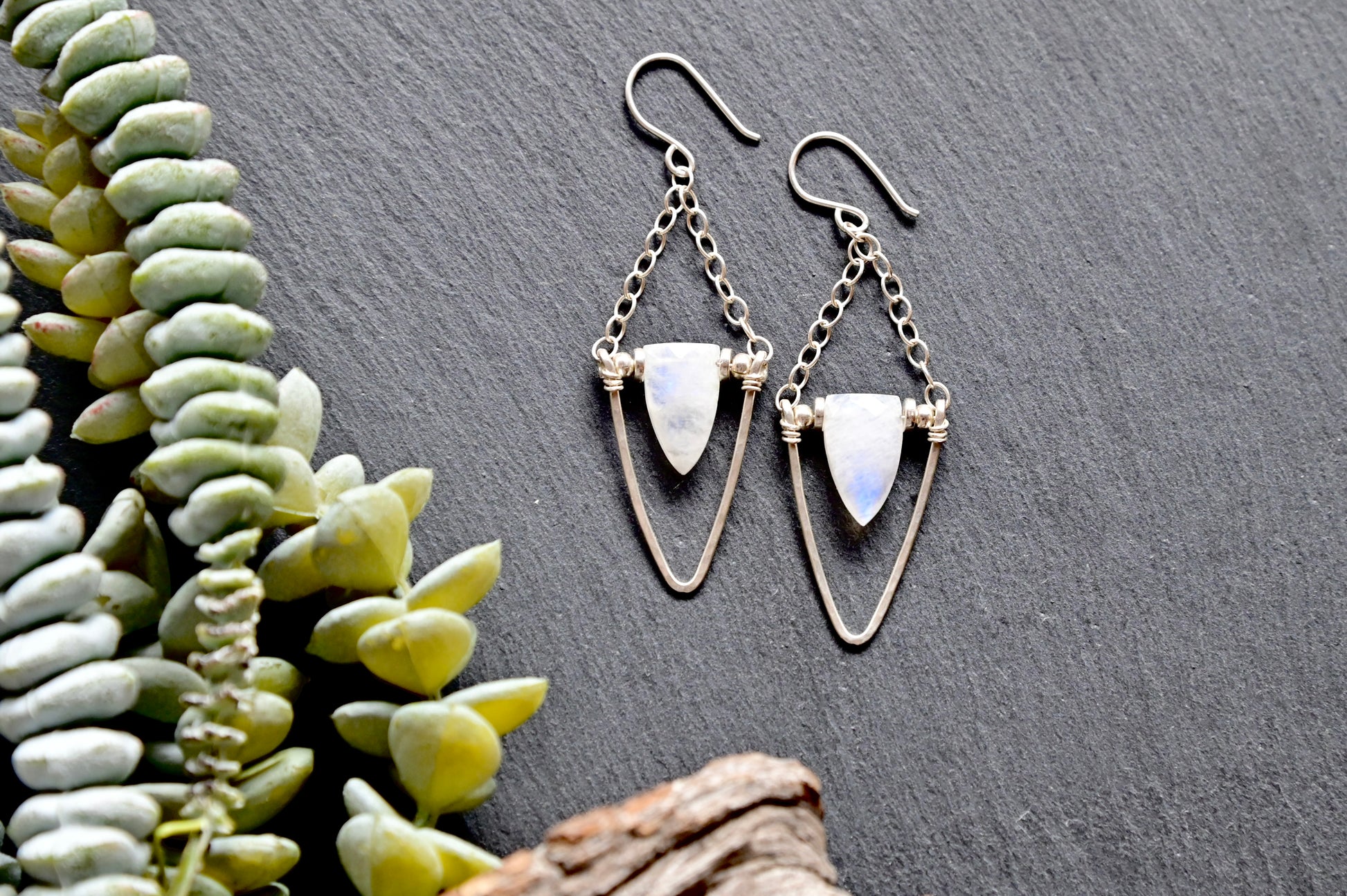Hand-formed and textured V-shaped hoop earrings in Sterling Silver with a faceted Moonstone gem in the shape of a shield.