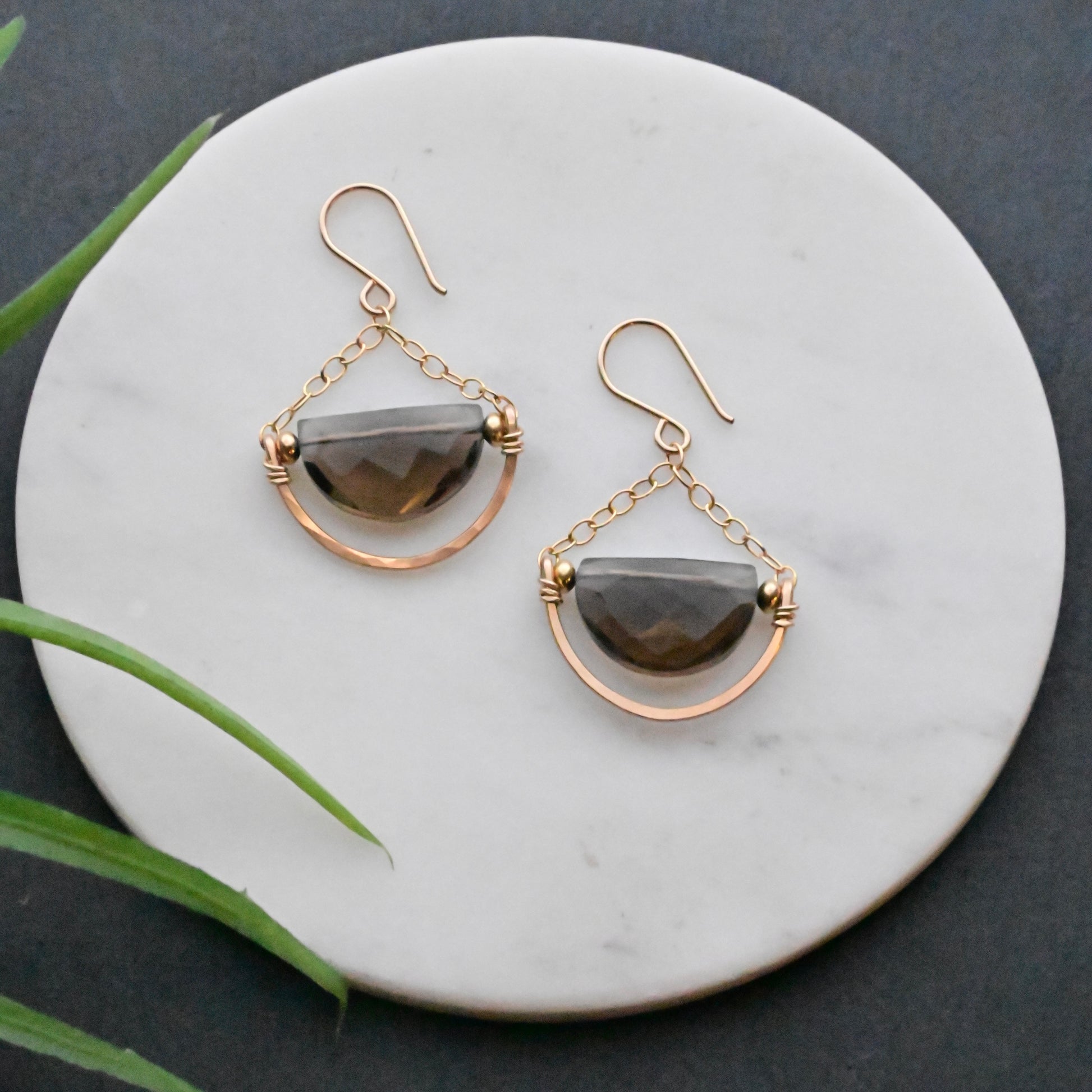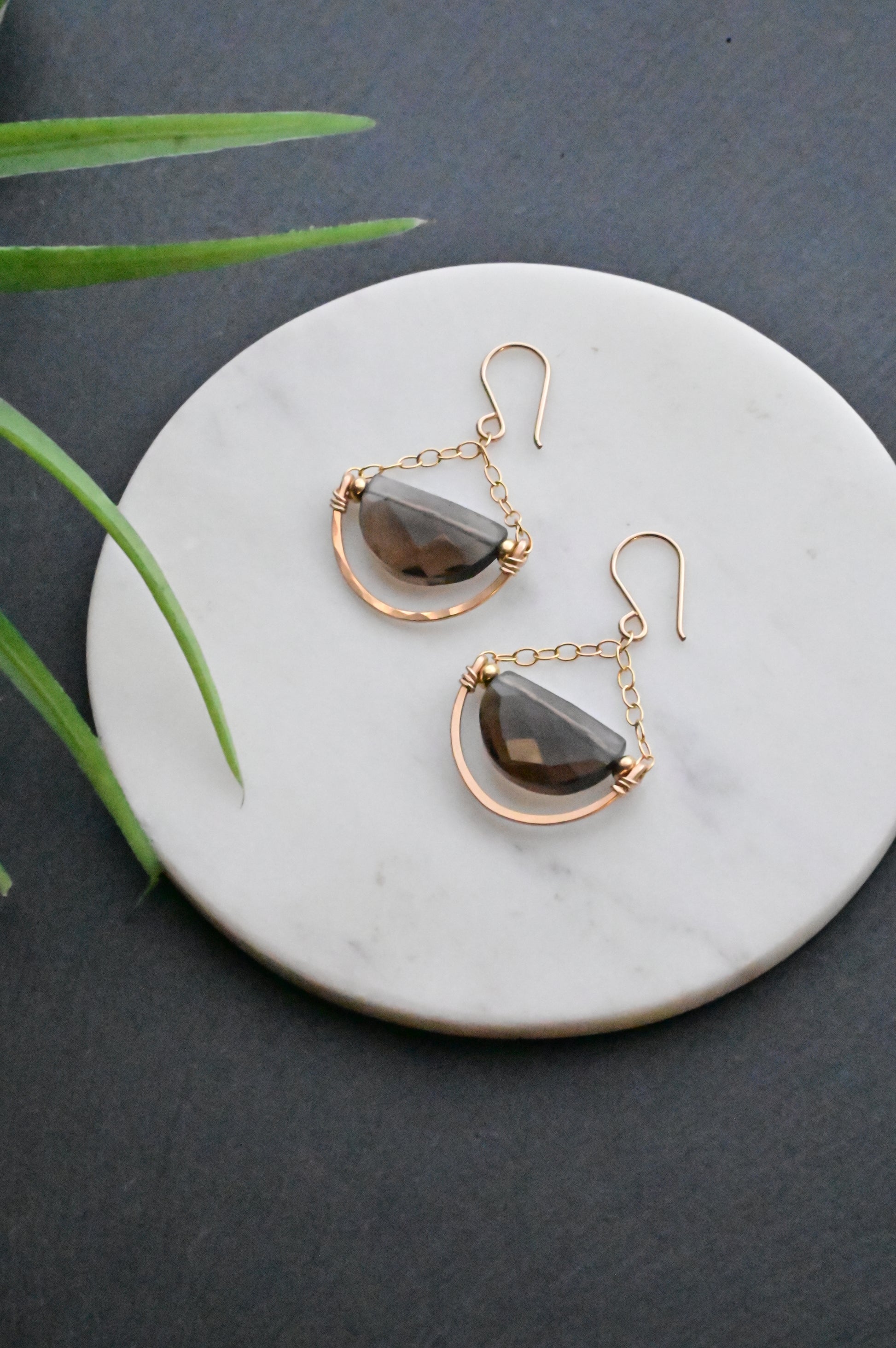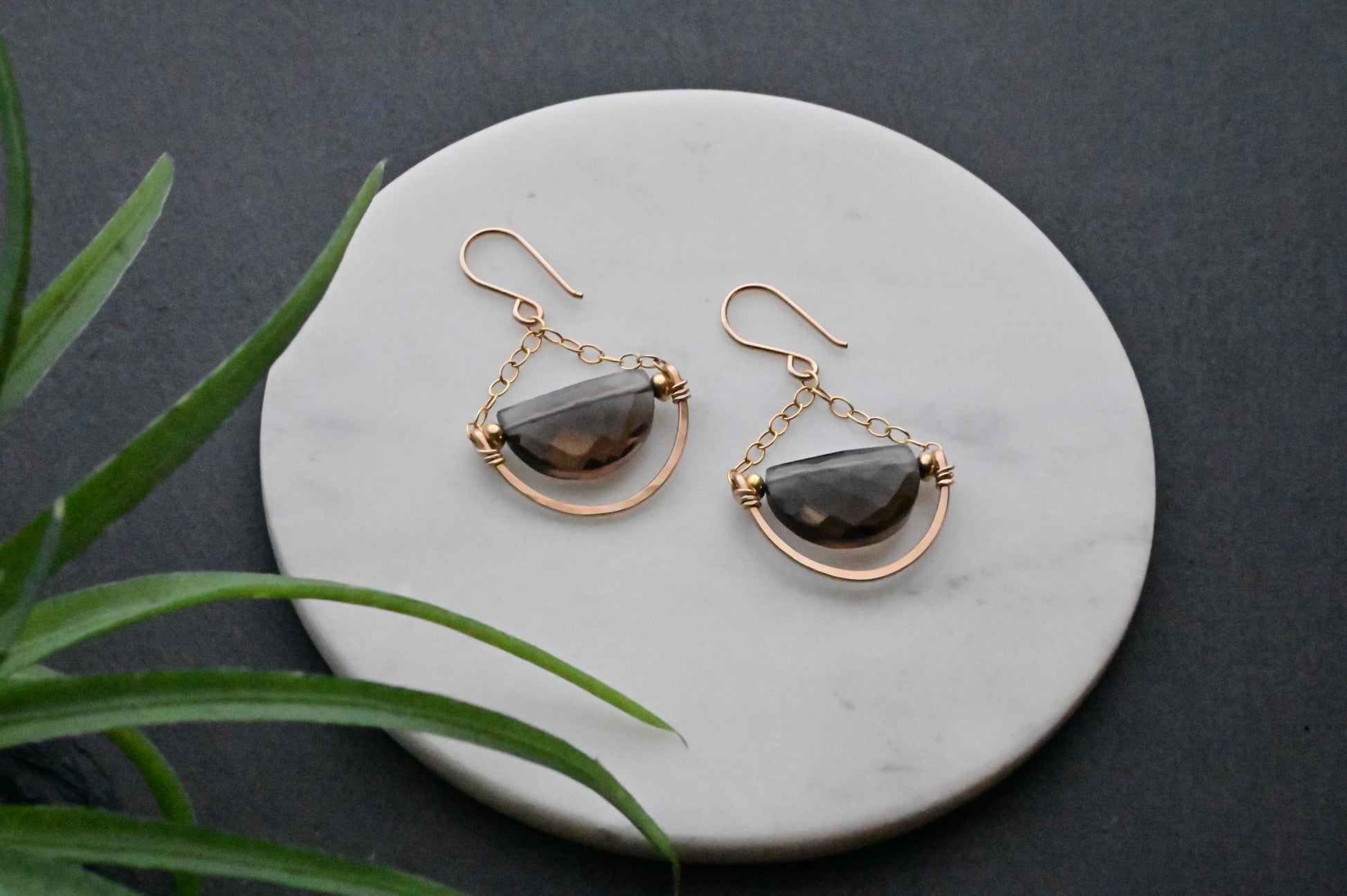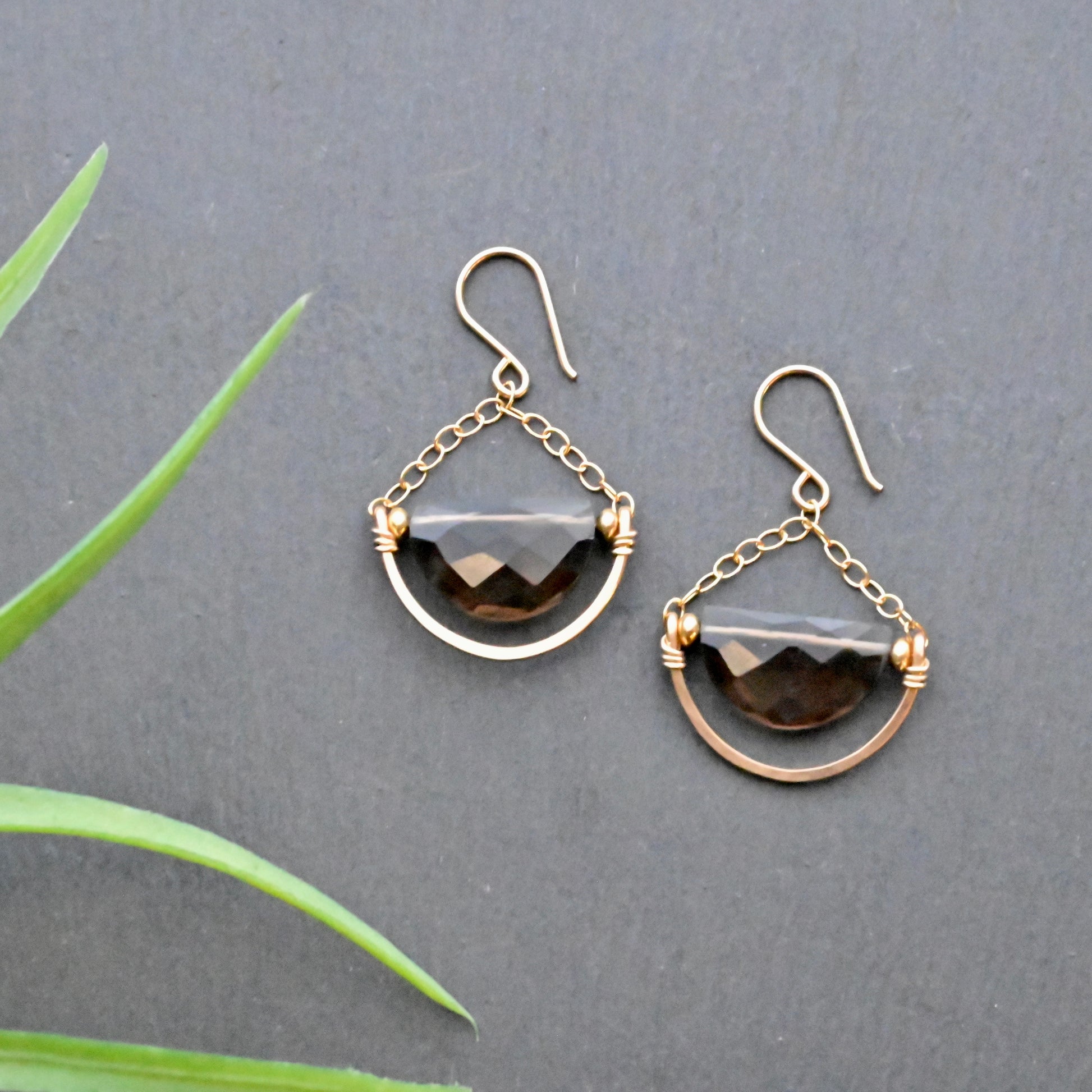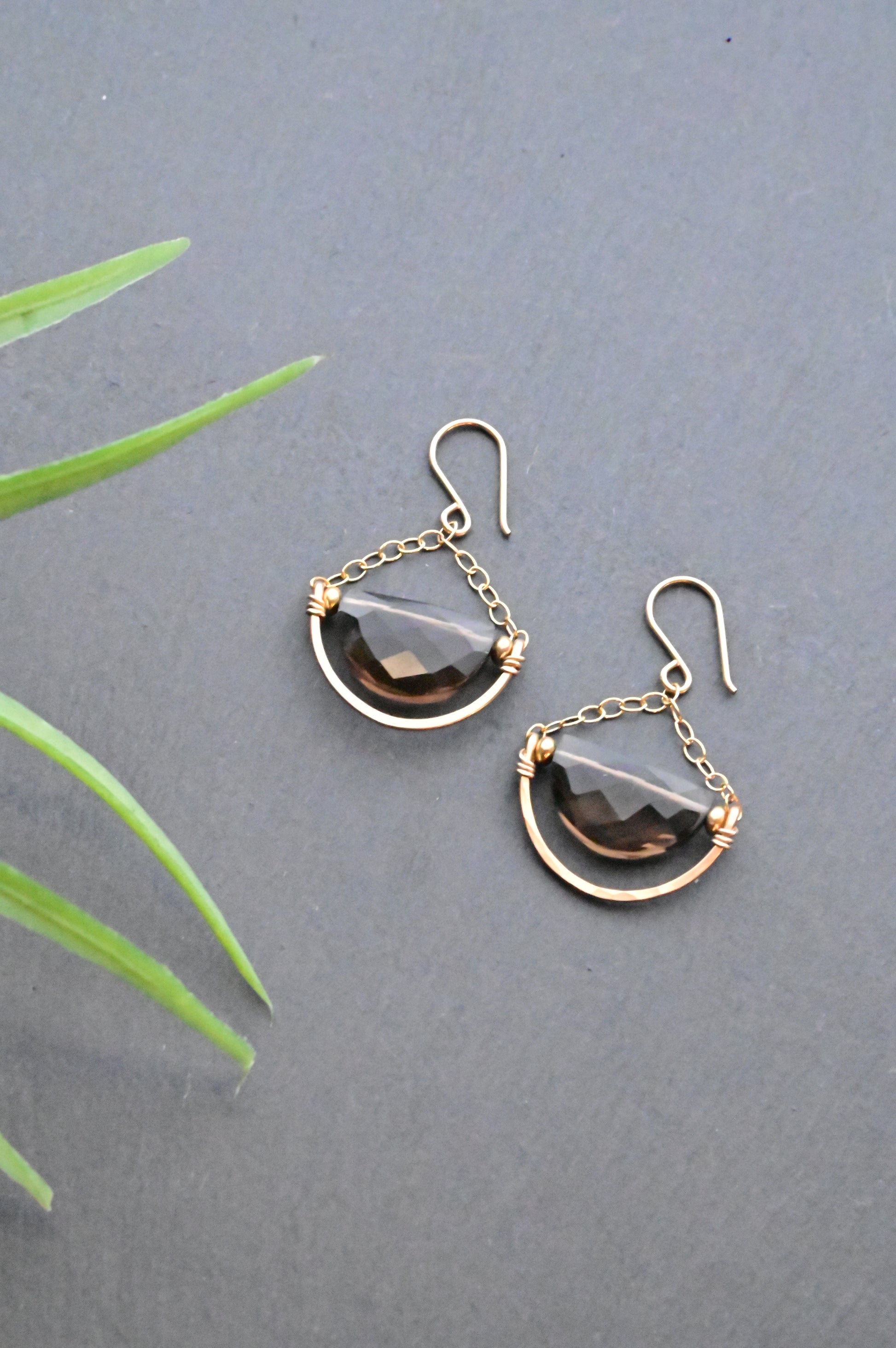 Handcrafted 14k Gold-fill hoop earrings featuring half-moon shaped faceted Smoky Quartz gemstones.