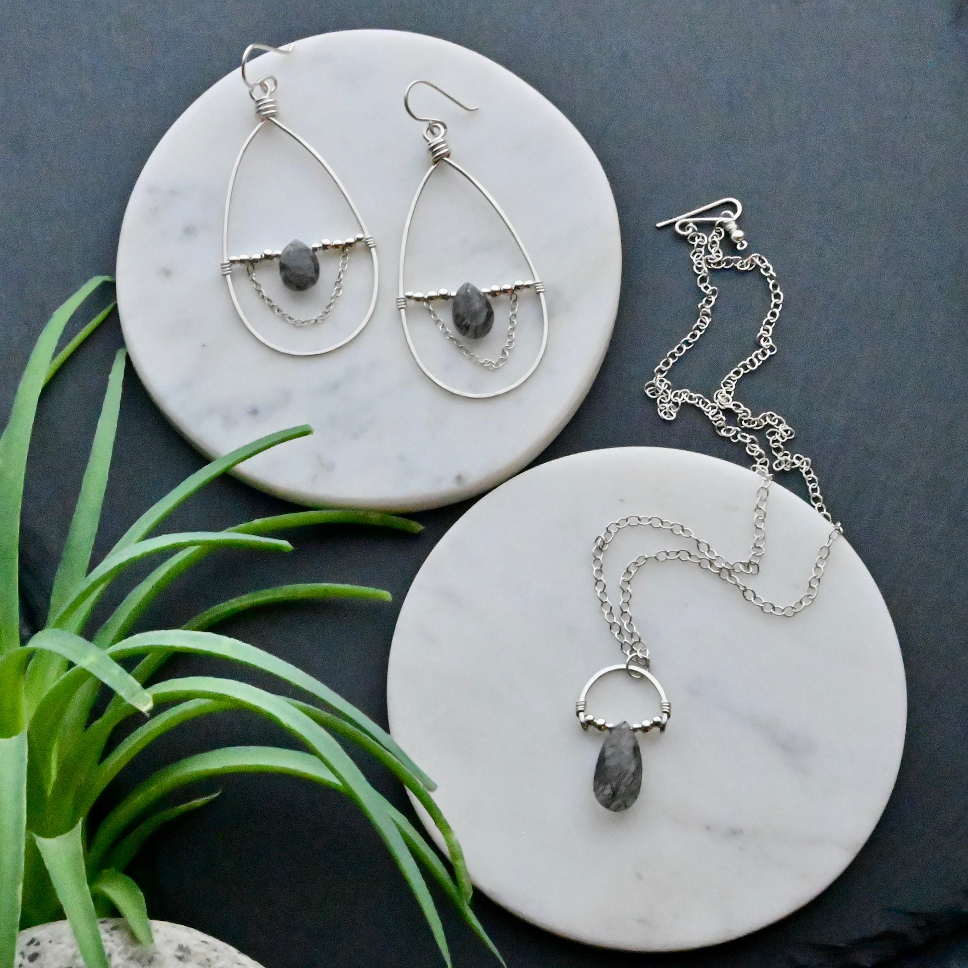 Hand-formed and hammered hoop earrings and pendant setting from Sterling Silver with faceted Tourmaline Quartz teardrops set within.