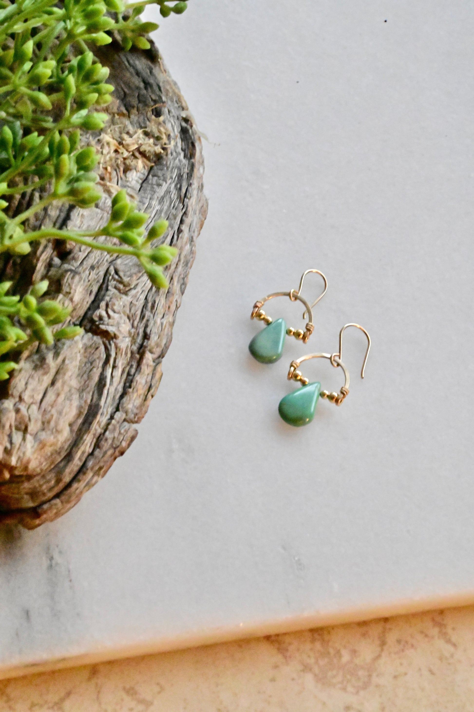 Handcrafted 14k Gold-fill hoop earrings with a small, smooth Turquoise teardrop set within.