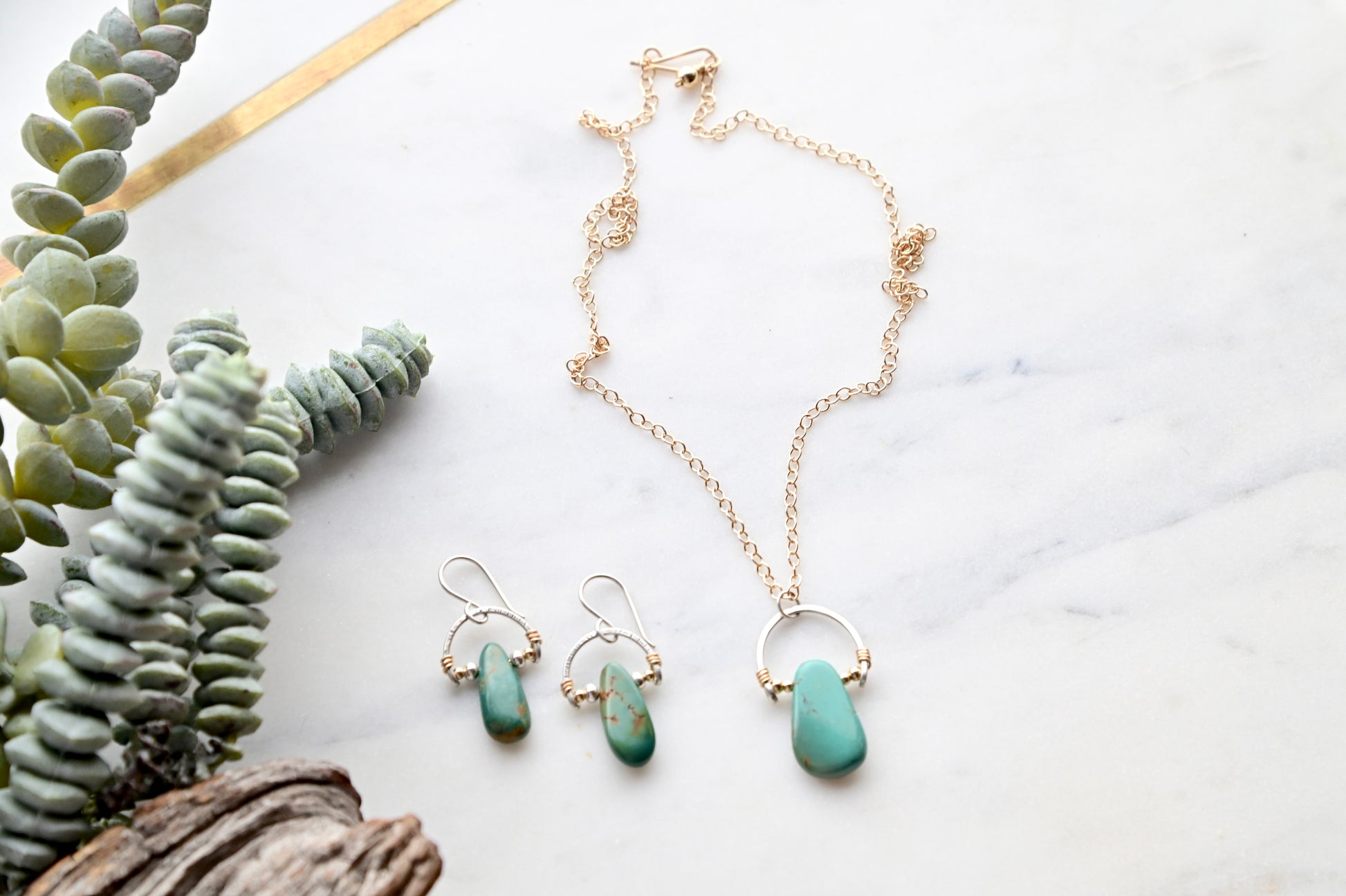 Hammered Hoops Necklace and Earrings Set in Turquoise with Sterling Silver and Gold-fill
