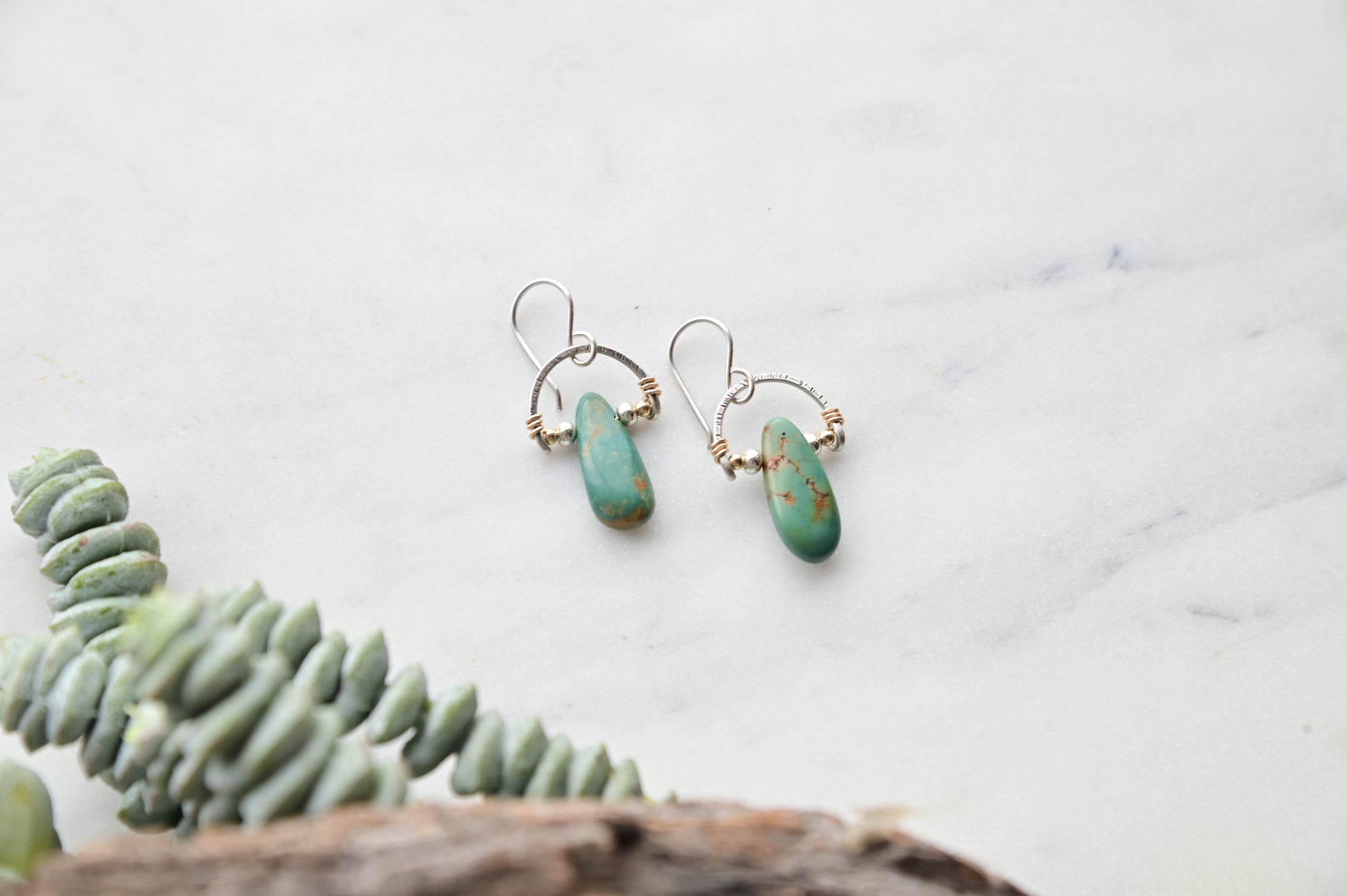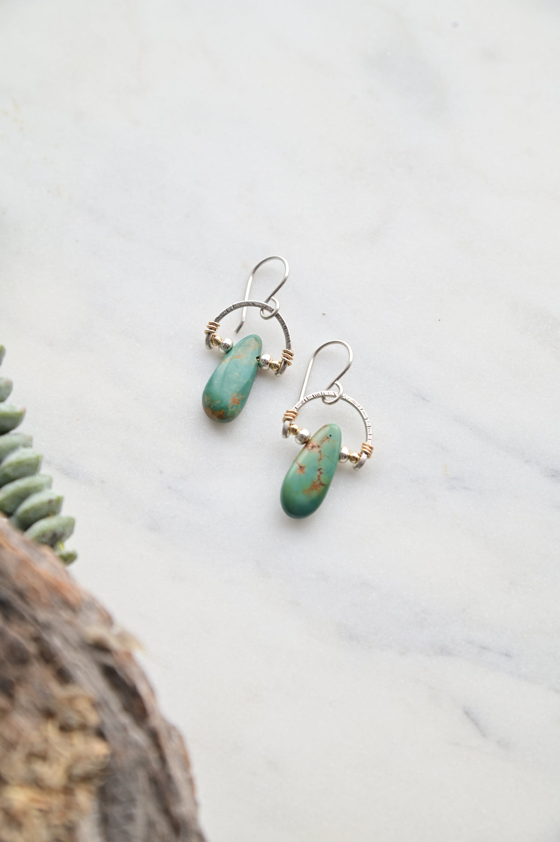 Hand-formed and textured hoops in Sterling Silver with a smooth Turquoise teardrop gemstone set within and complimented with 14k Gold-fill accents.