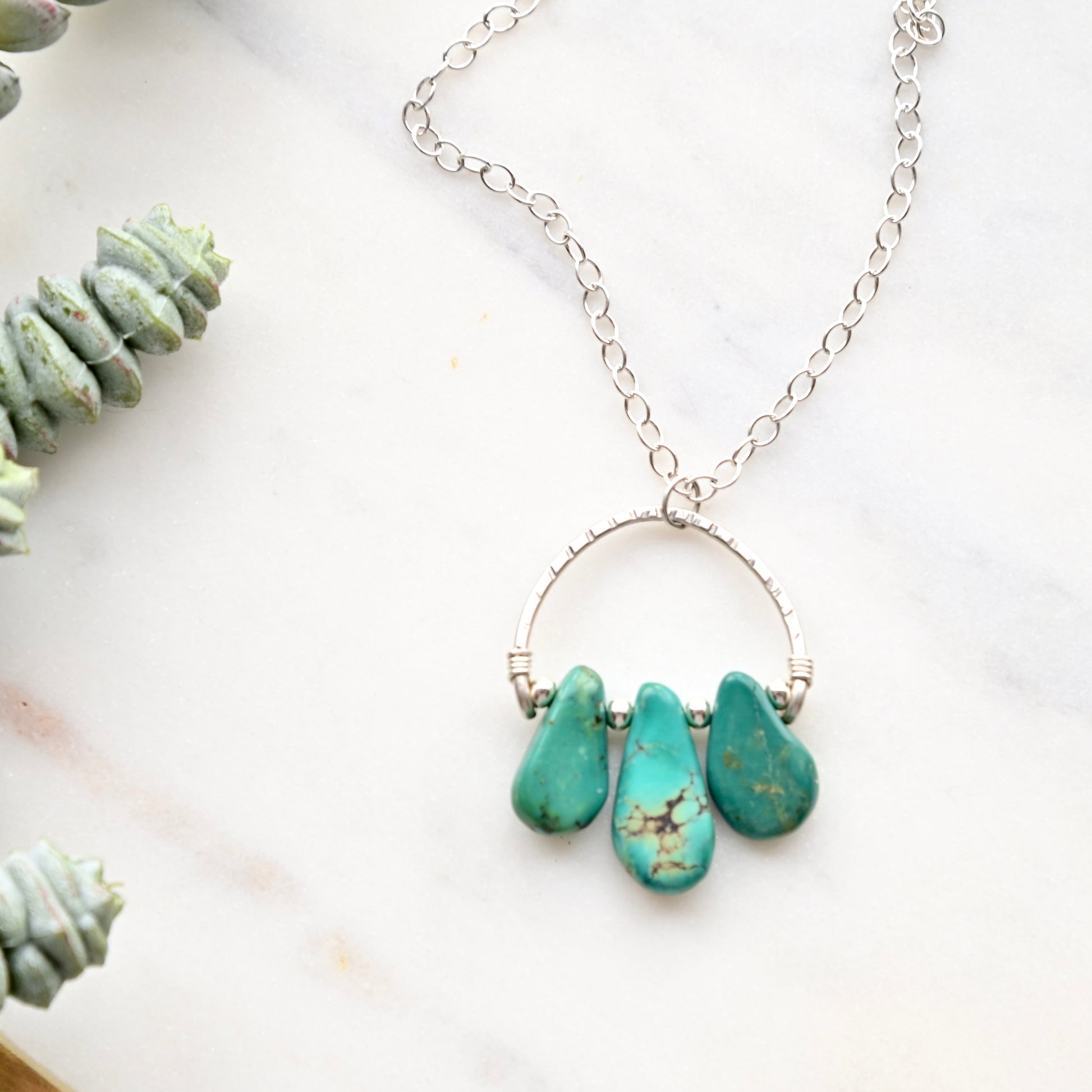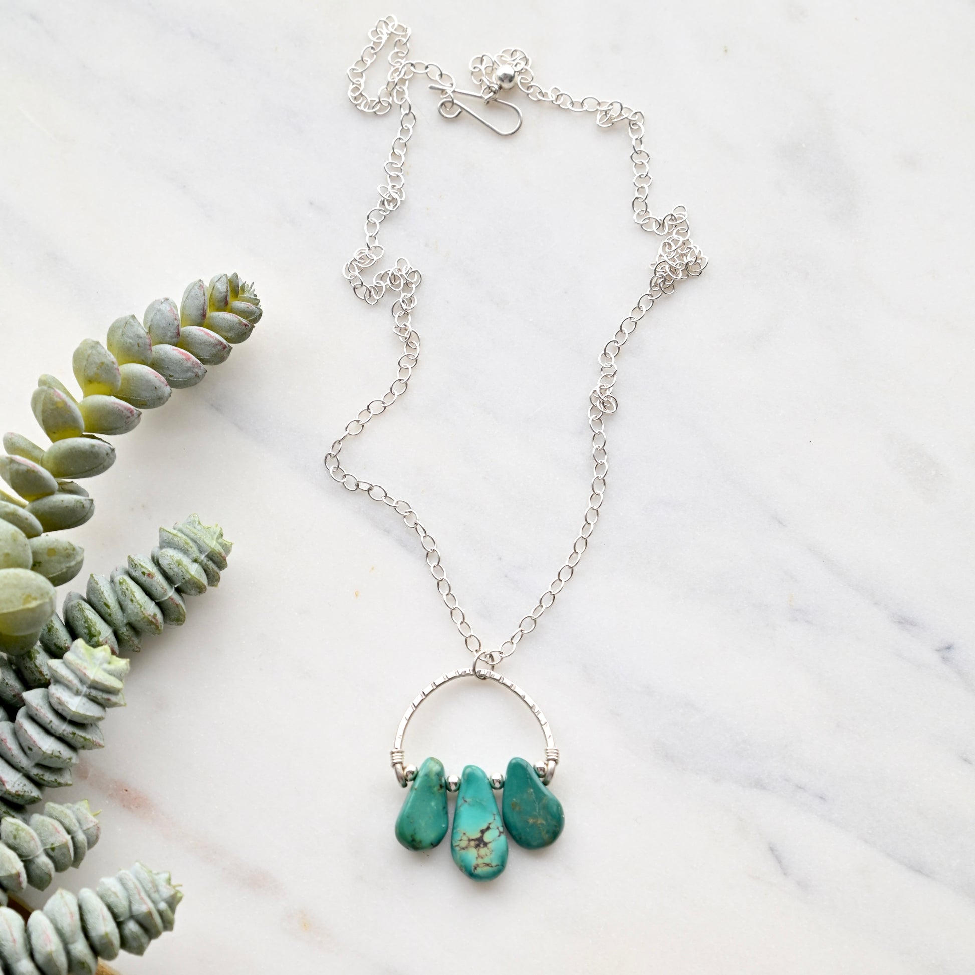 Hand-formed and textured Sterling Silver hoop pendant, paired with three smooth Turquoise teardrop gemstones set within.
