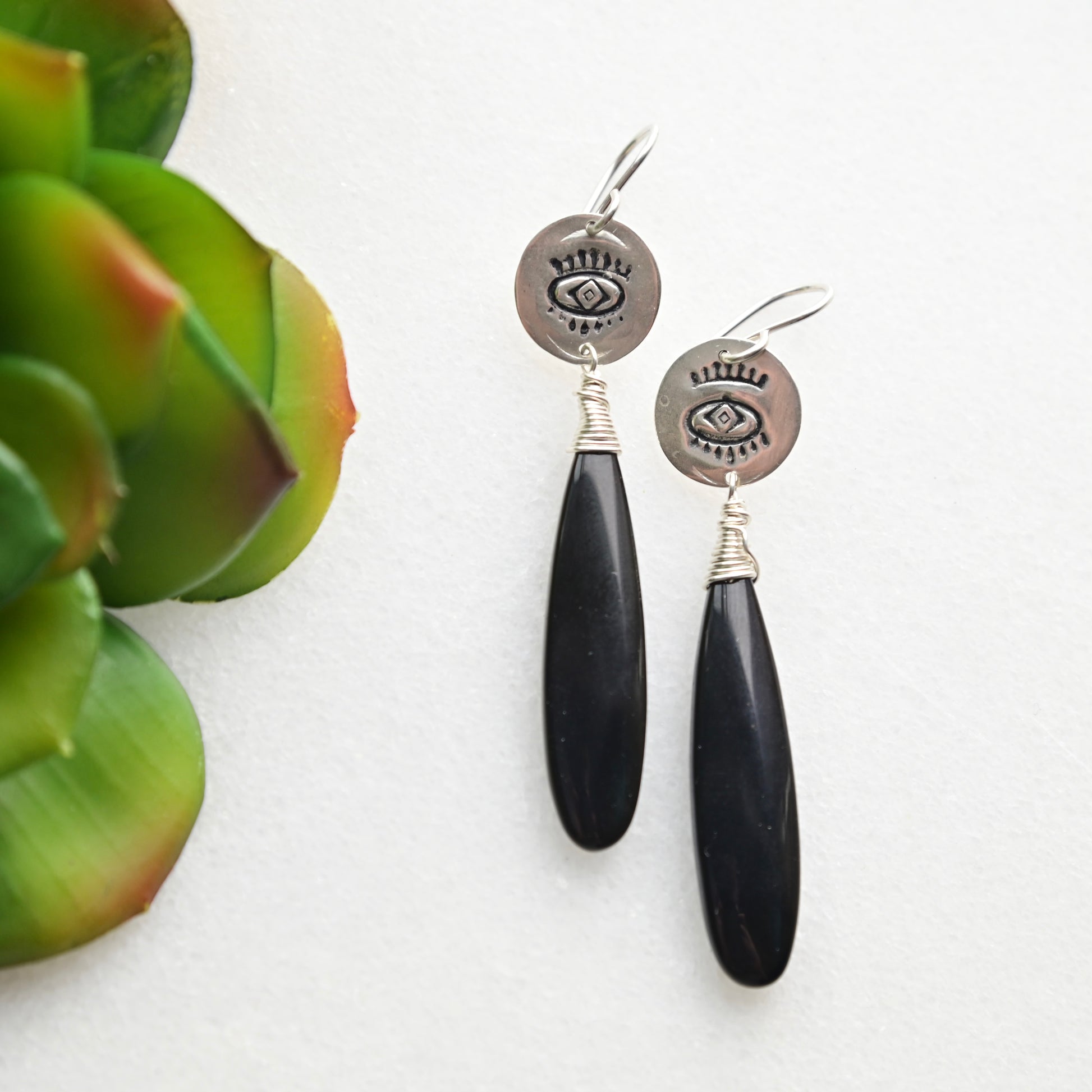 Handcrafted and stamped Sterling Silver eye elements with long, smooth Black Obsidian teardrops.