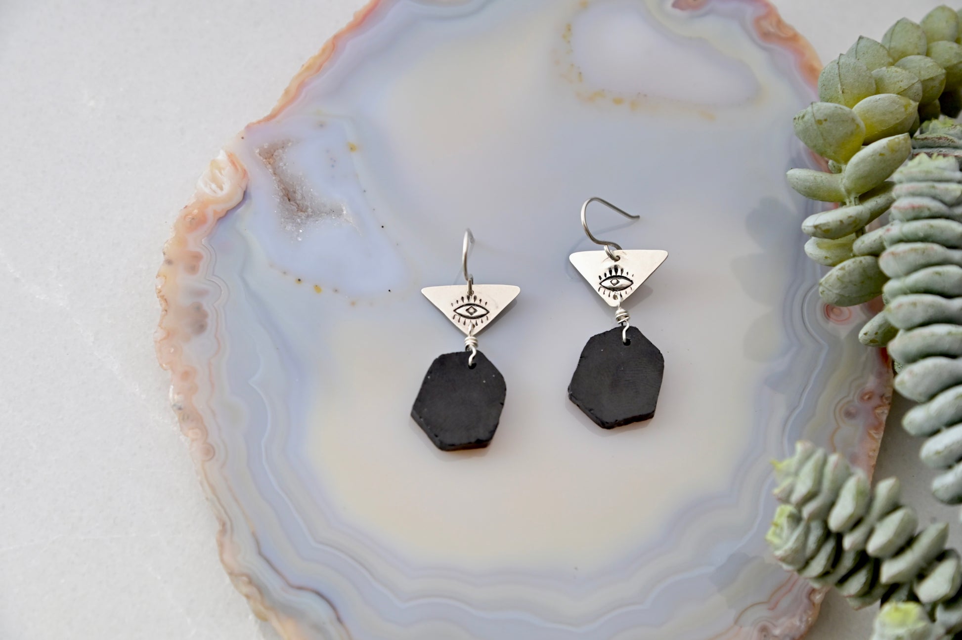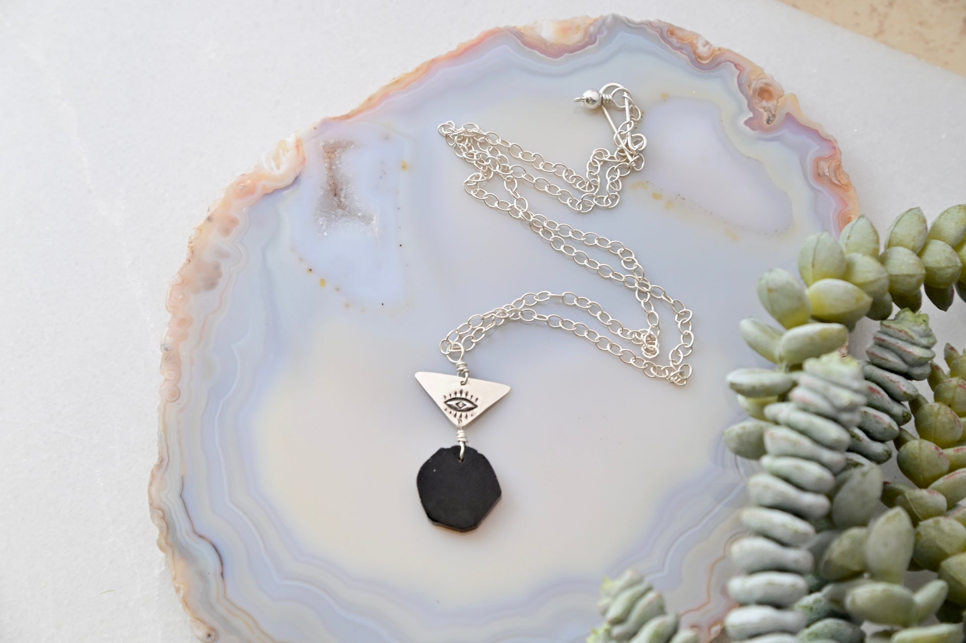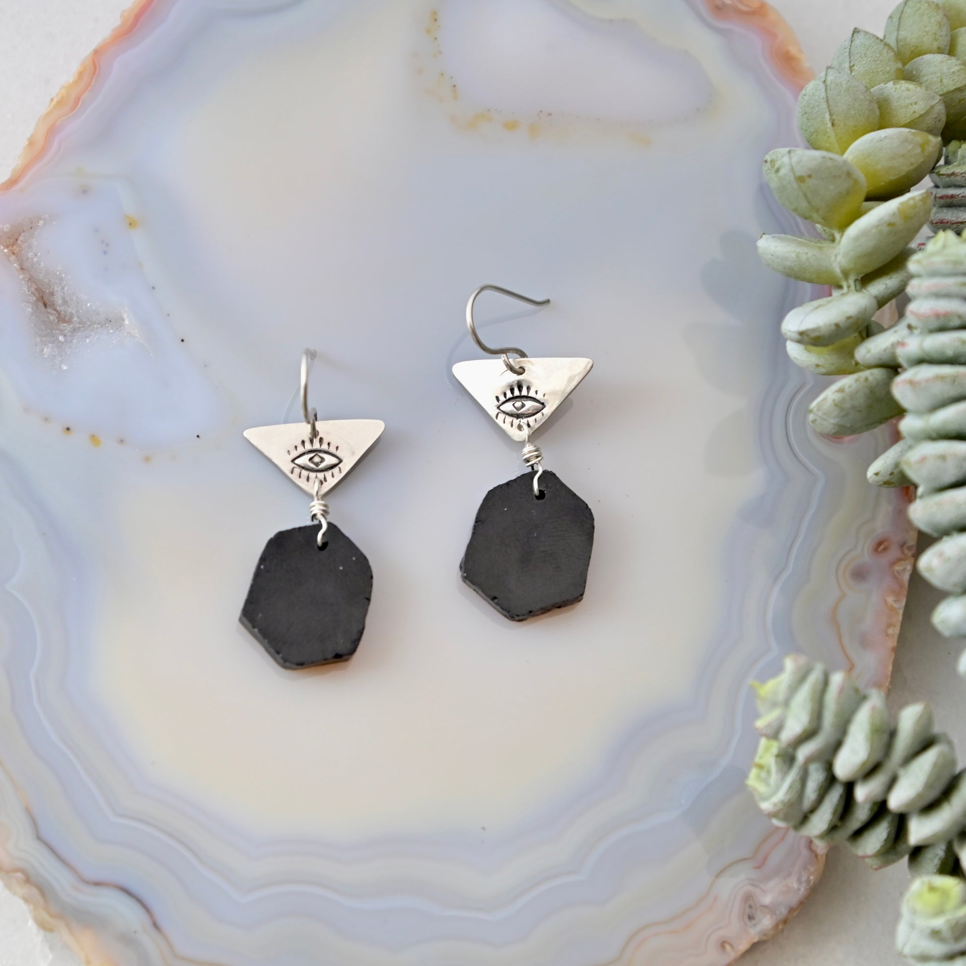 Hand-sawn and individually stamped Sterling Silver 'Eye' focal pieces, complimented with smooth Black Tourmaline gemstones with a natural edge.
