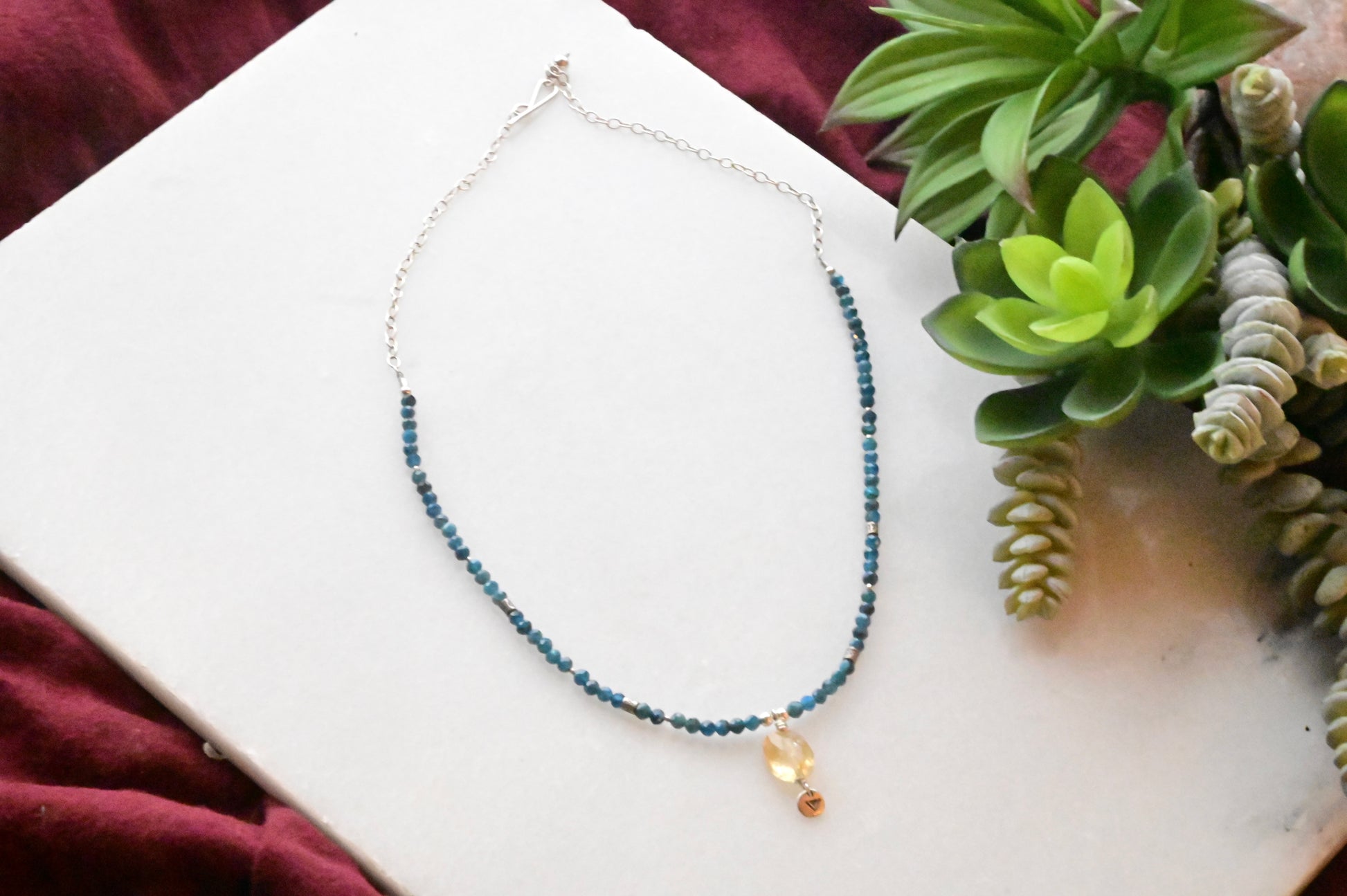 A bright Citrine gemstone with a small handcrafted Sterling Silver drop compose the pendant suspended within small faceted Apatite gemstones.