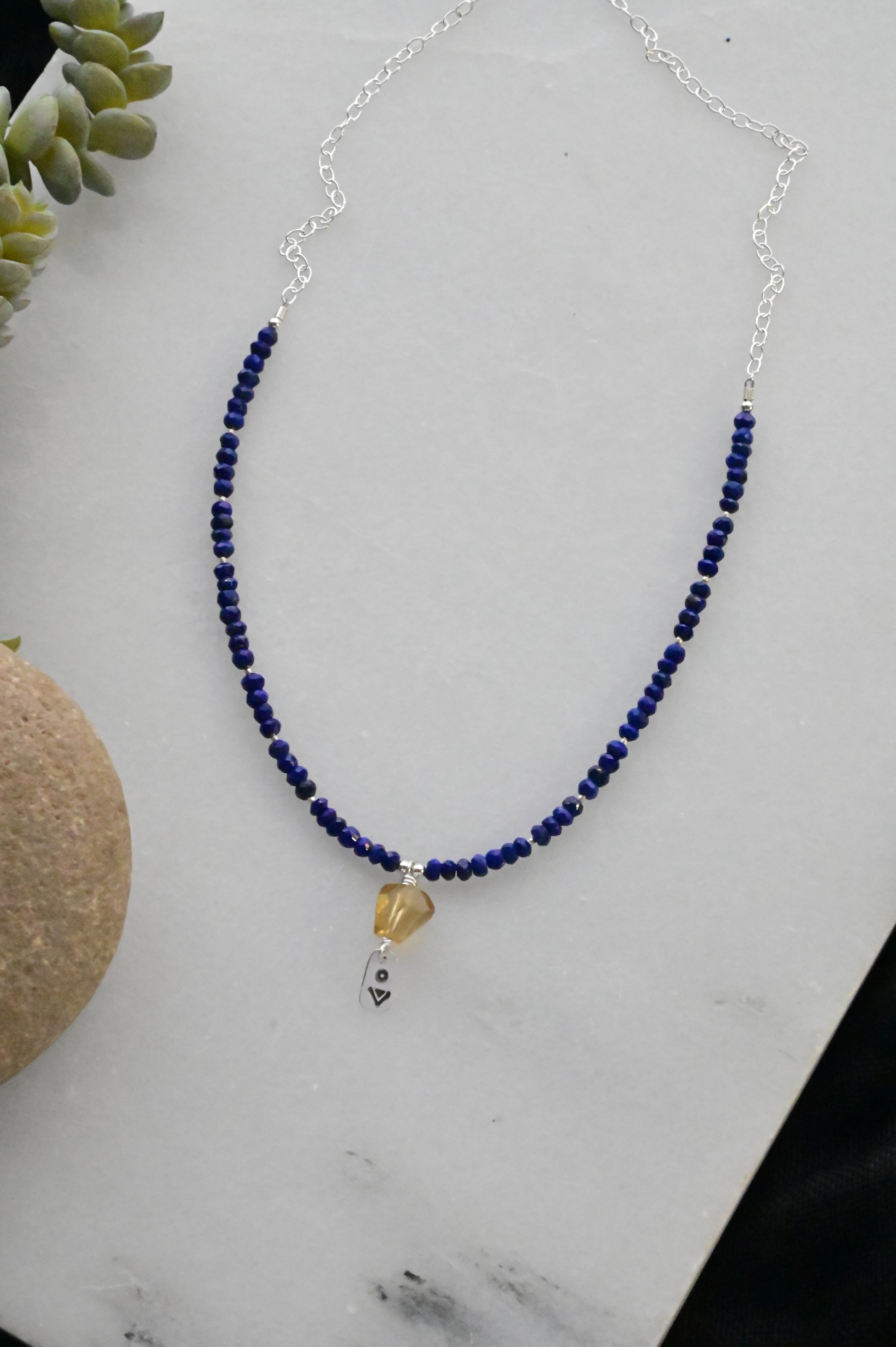 Handcrafted and stamped Sterling Silver pendant with a Citrine gemstone, accented around then neck with small faceted Lapis Lazuli stone and sterling details.