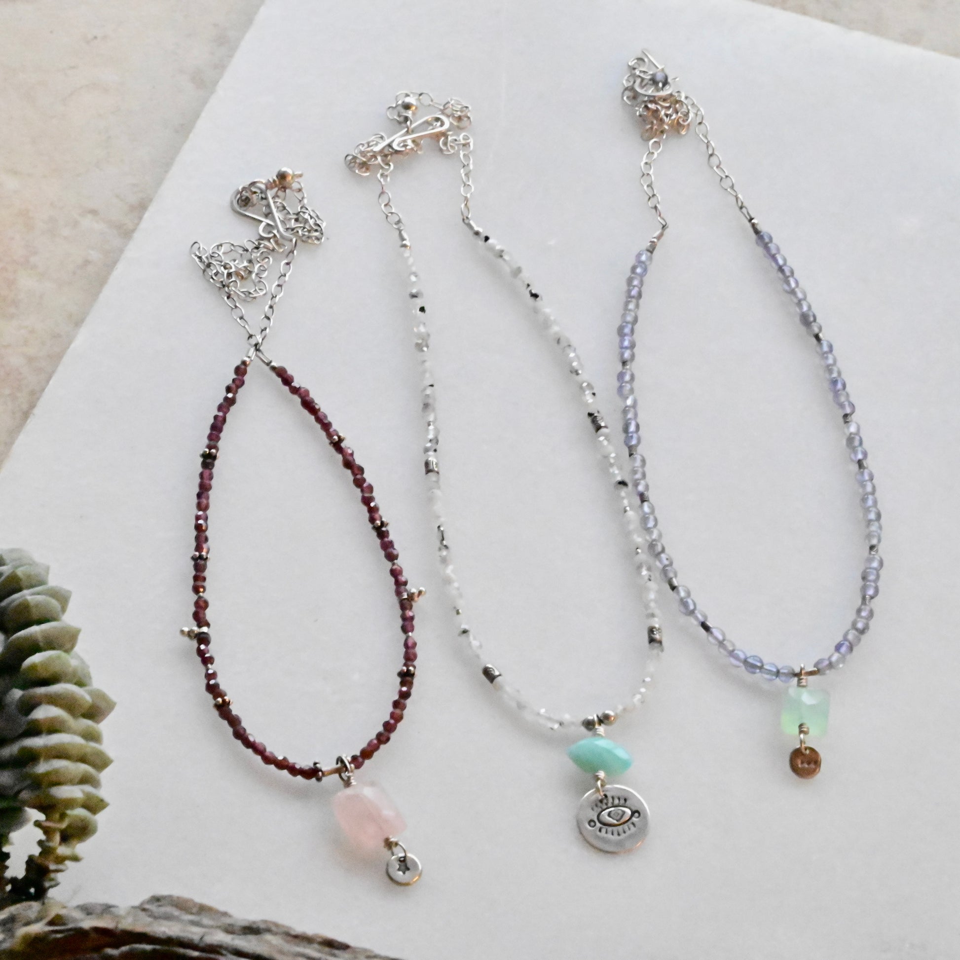 Each small pendant is handcrafted from Sterling Silver and individually stamped with a unique designs. Paired with a large gemstone for the focal pendant and then accented with small gemstones and sterling silver accents.