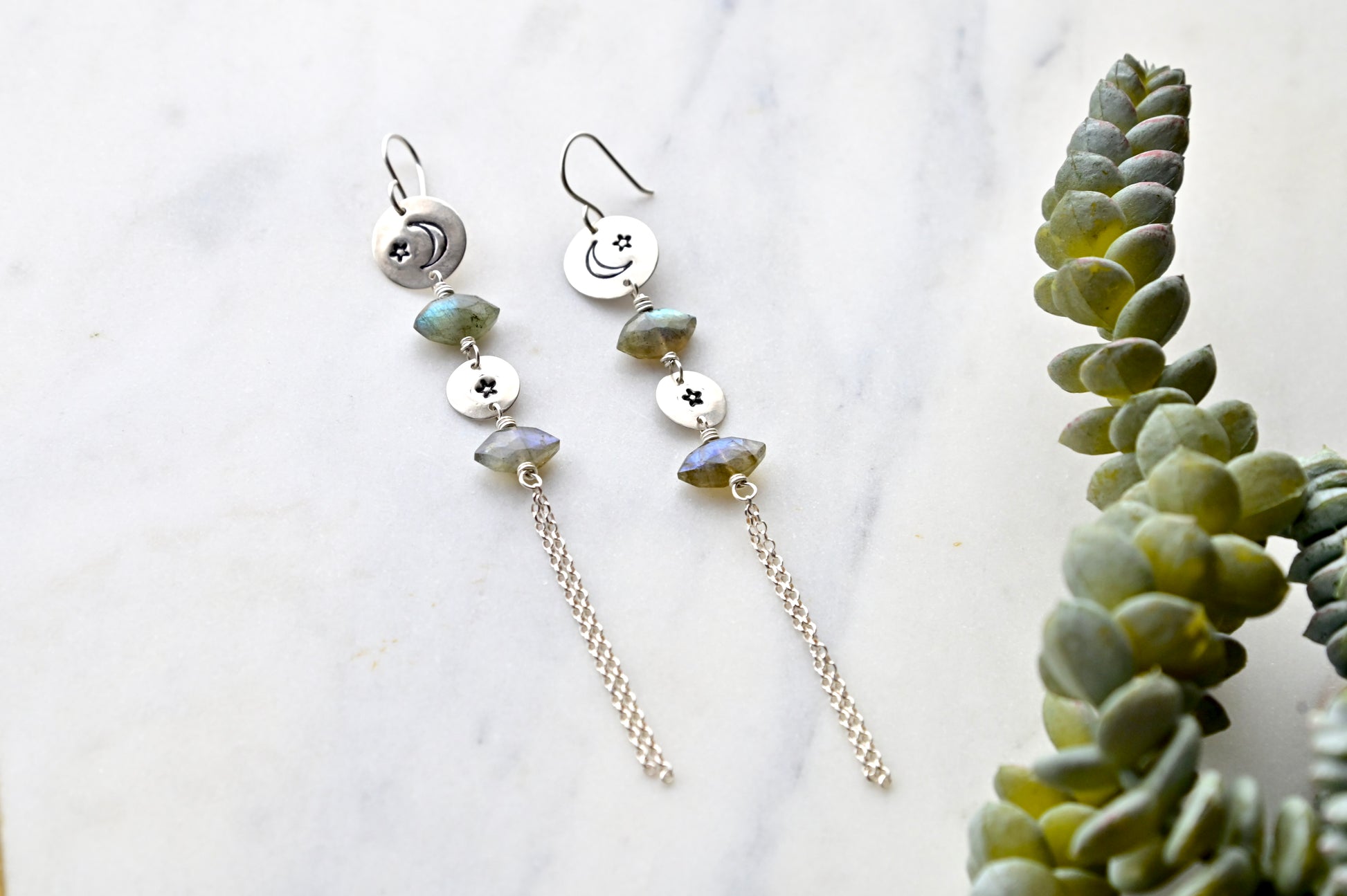 Hand-cut and individually stamped Sterling Silver earrings with flashy eye-shaped faceted Labradorite gemstones and a sterling chain tassel.