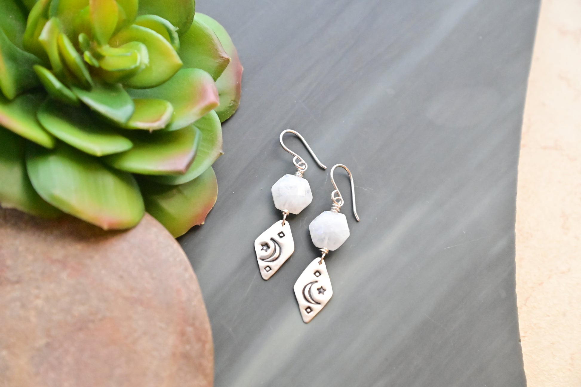 Hand-cut and stamped Sterling Silver moon elements paired with faceted hexagon-shaped Moonstone gems.
