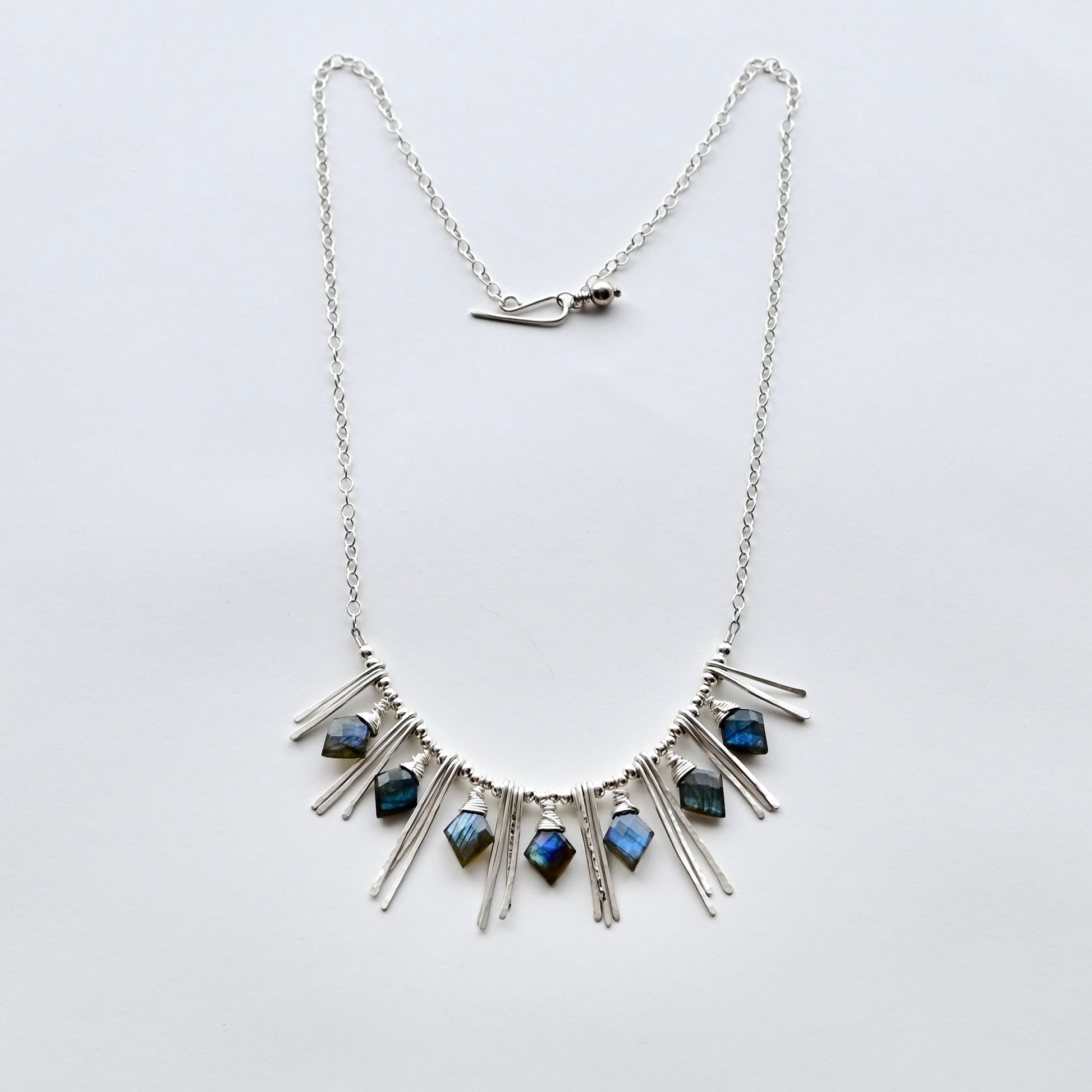 Handcrafted and textured fringe in Sterling Silver, mixed with brilliant diamond shaped faceted Labradorite gemstones set in hand-wrapped sterling links.