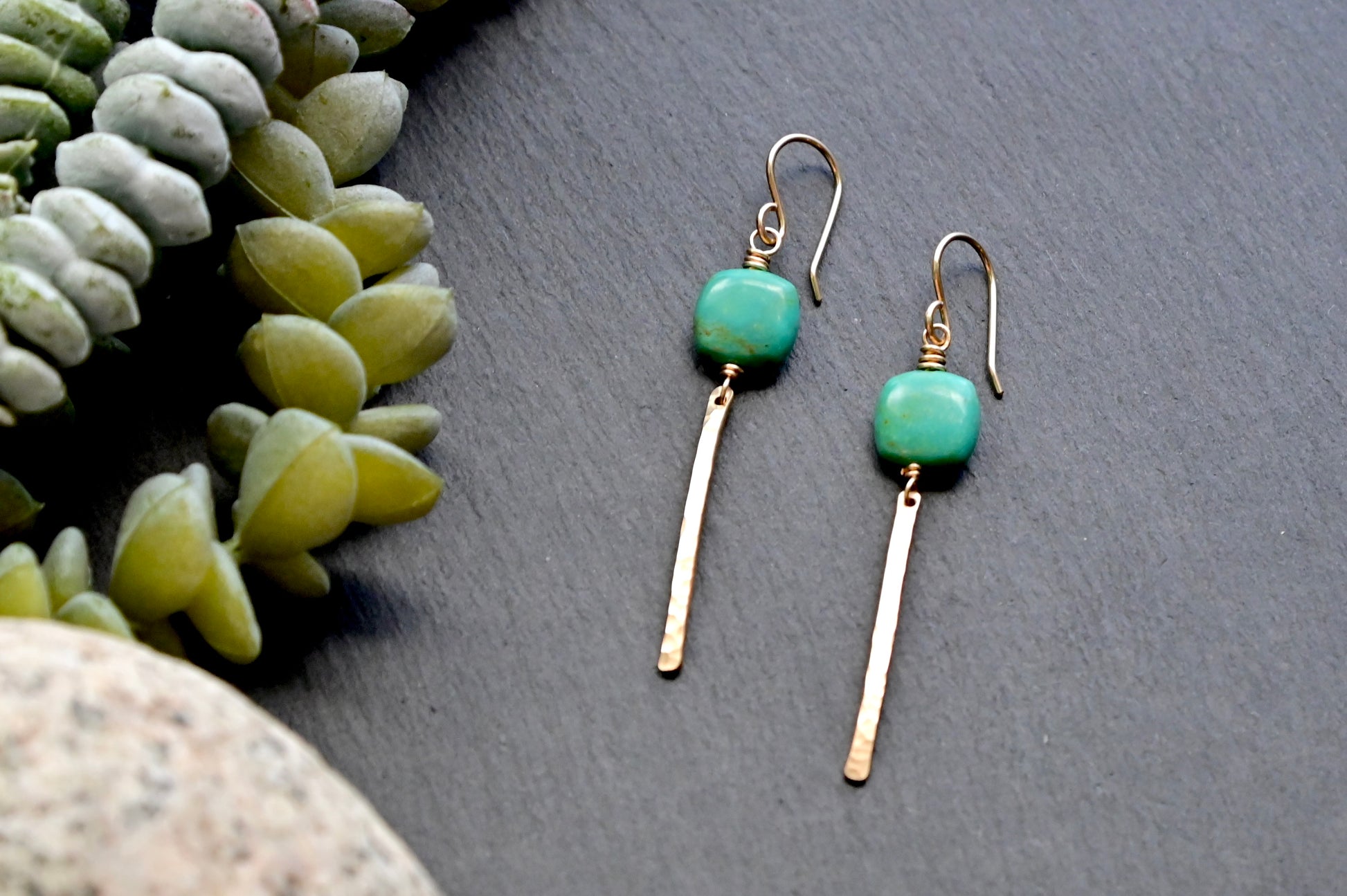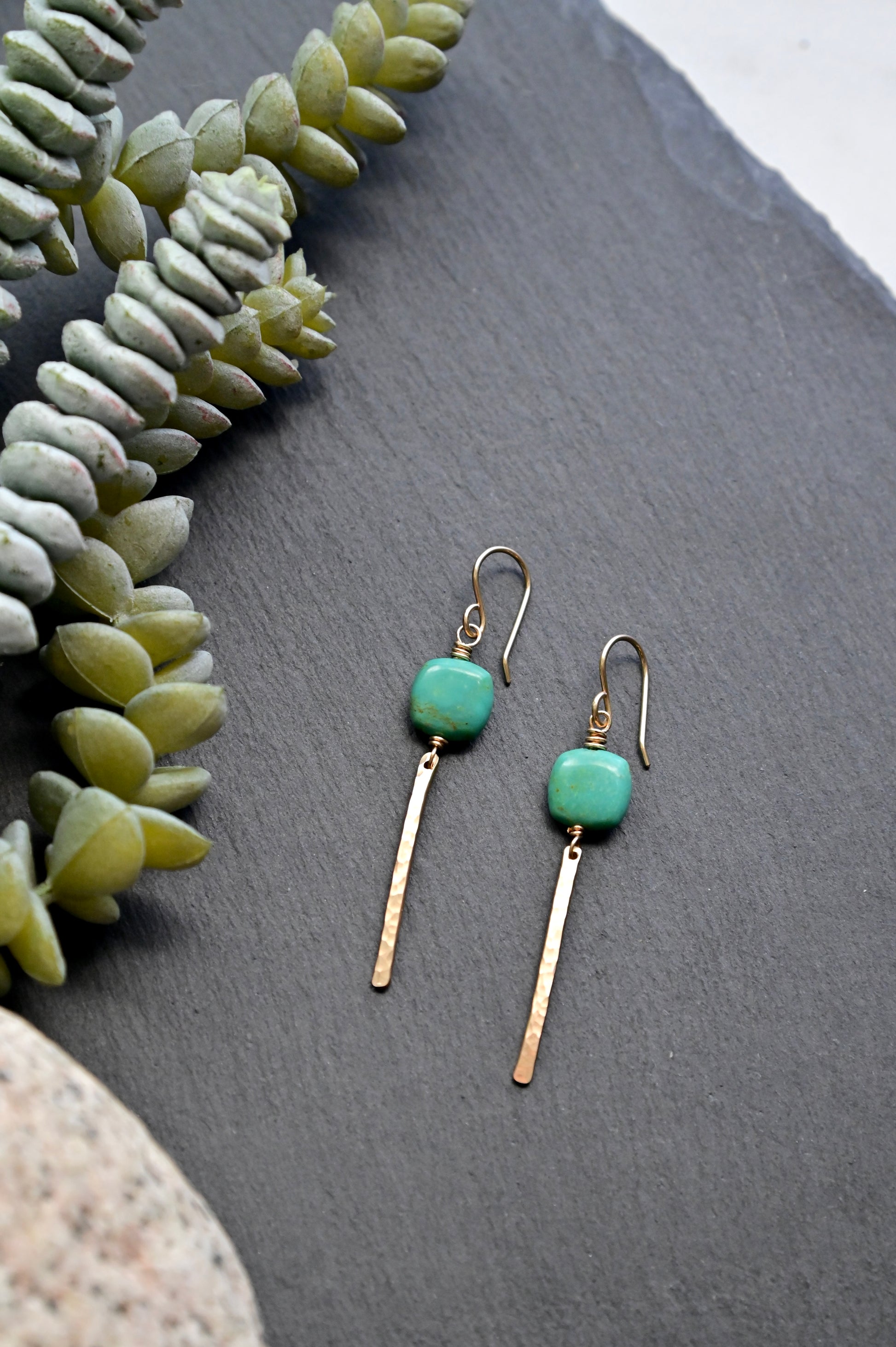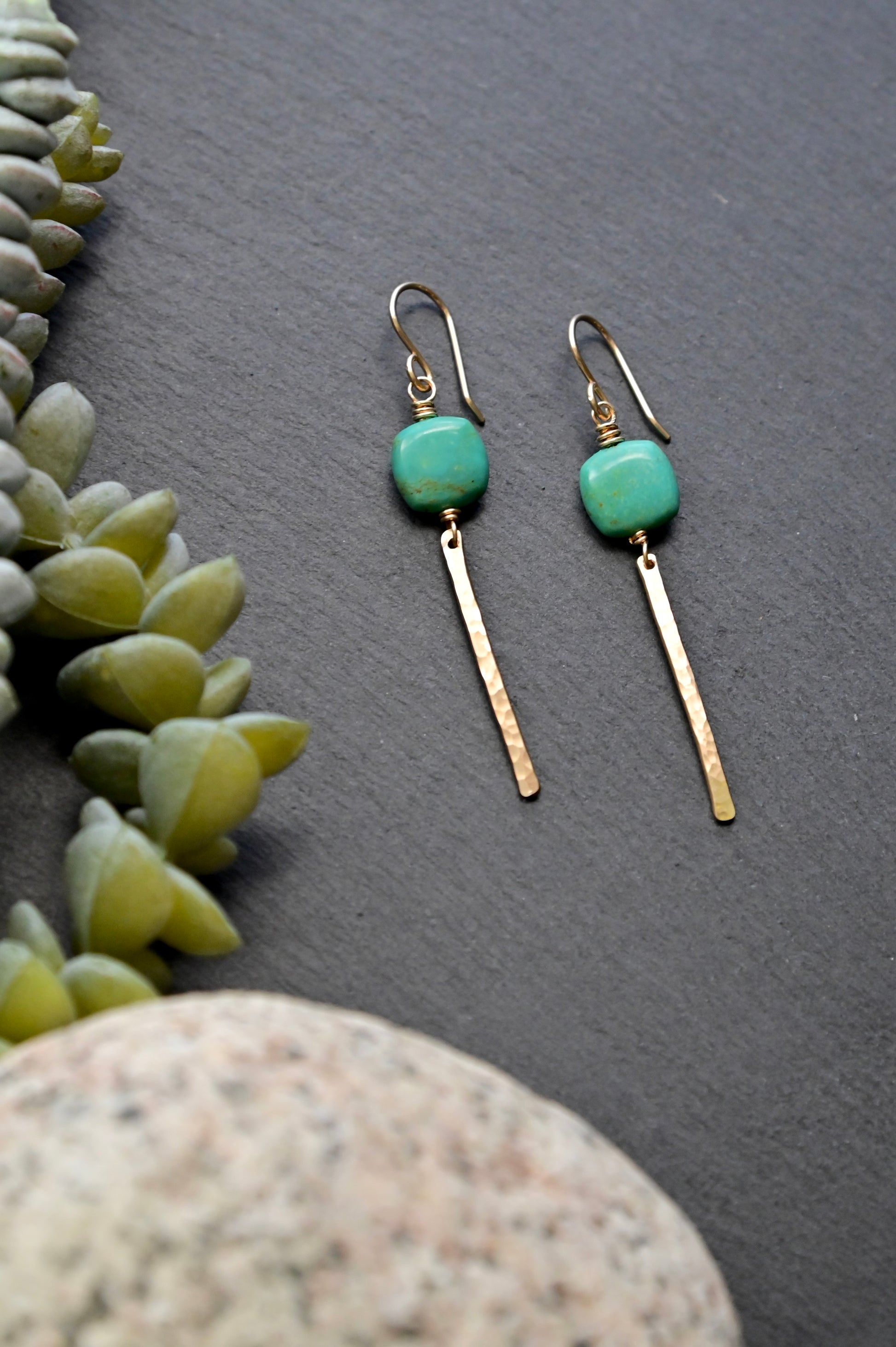 Handcrafted and textured 14k Gold-fill "sticks" paired with smooth square-shaped Turquoise gemstones.